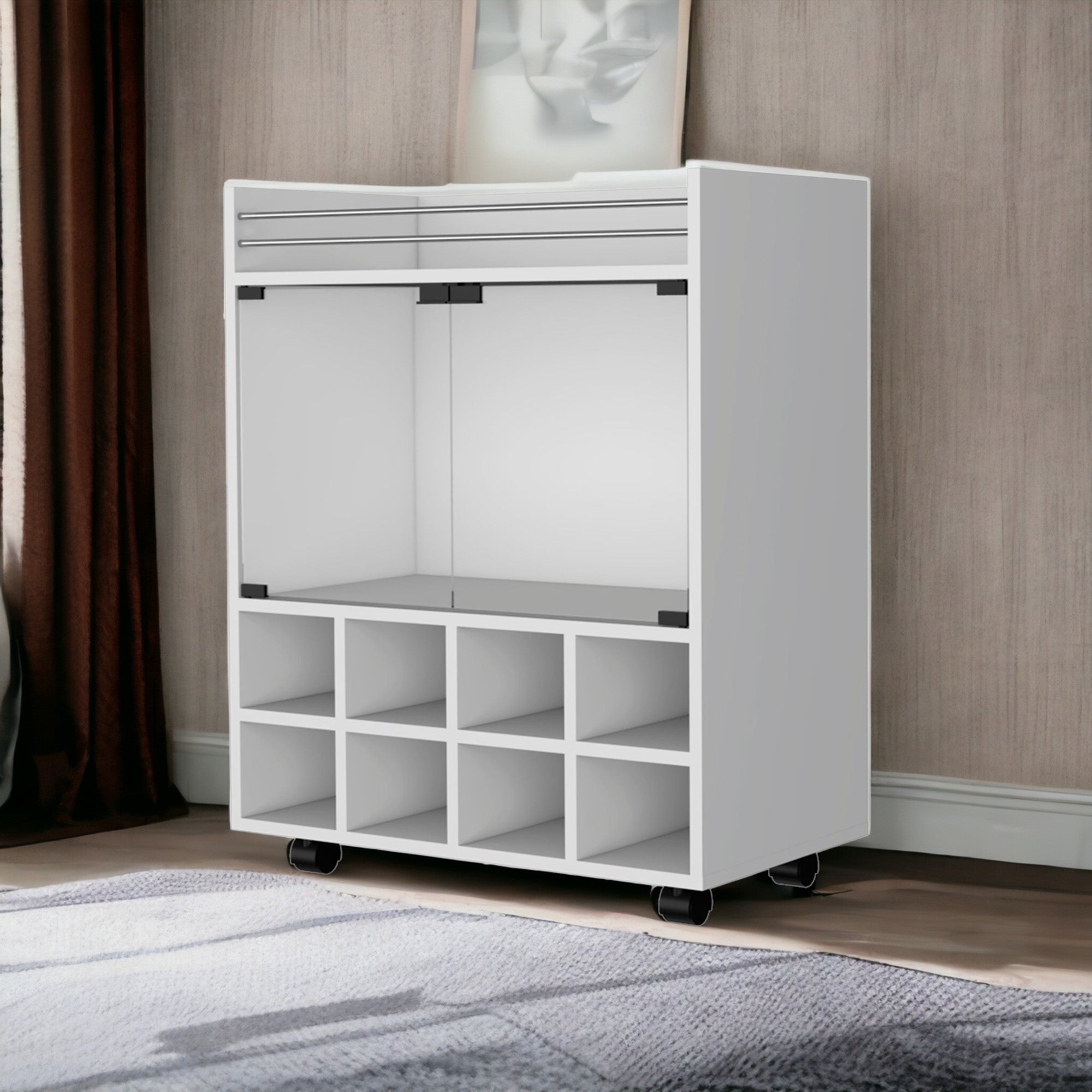 - Modern white bar cart with a rectangular shape.
