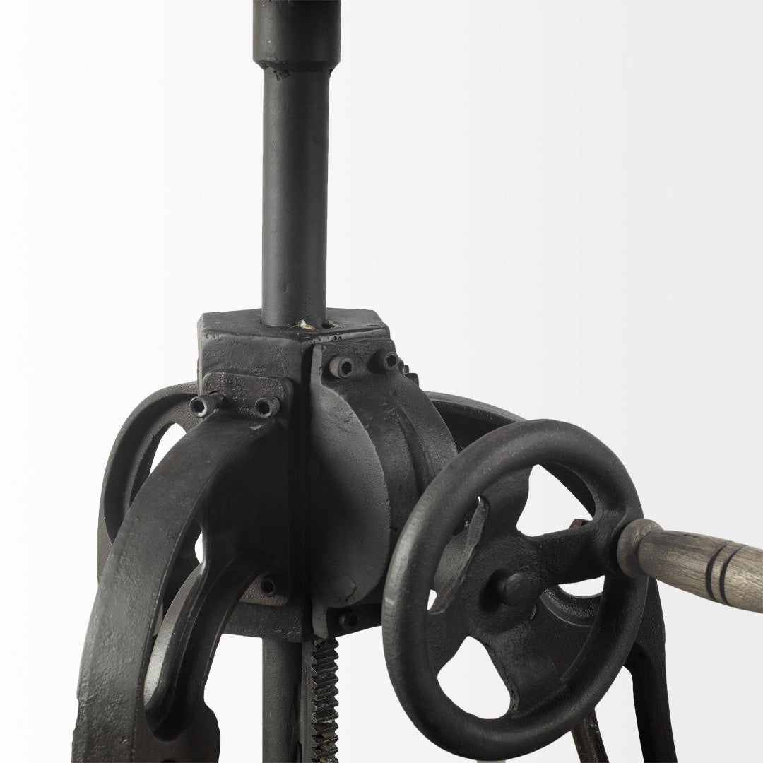 - Featuring a round top braced by a three-legged, industrial-inspired iron base that is equipped with a crankshaft, the Emslie III is truly unique in terms of design, blending unexpected materials and colors to elevate your space.