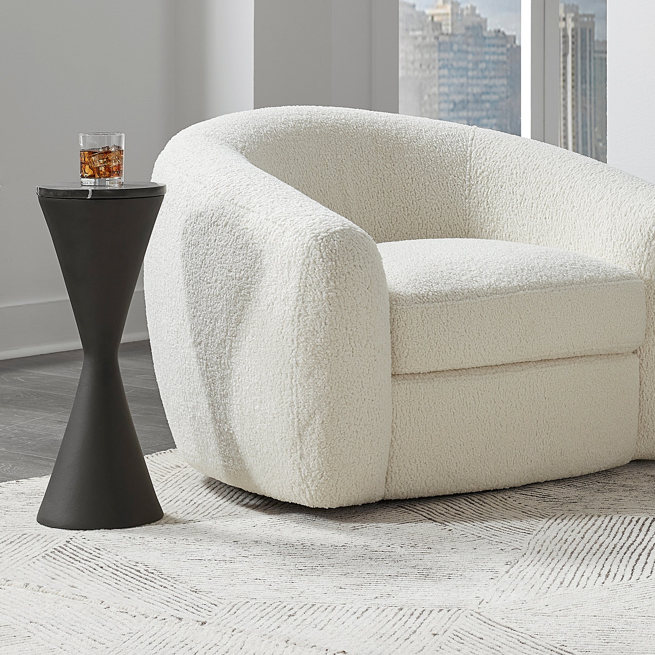 - Finish/Frame Description: The Time's Up Table Brings Contemporary Flair To Your Space. The Modern Hourglass Shape Is Finished In A Lightly Textured Matte Black And Is Topped By Black Marble With Natural White Veining. Because Of The Natural Characteristics Of Marble, Each Piece Will Have Unique Veining Patterns.
