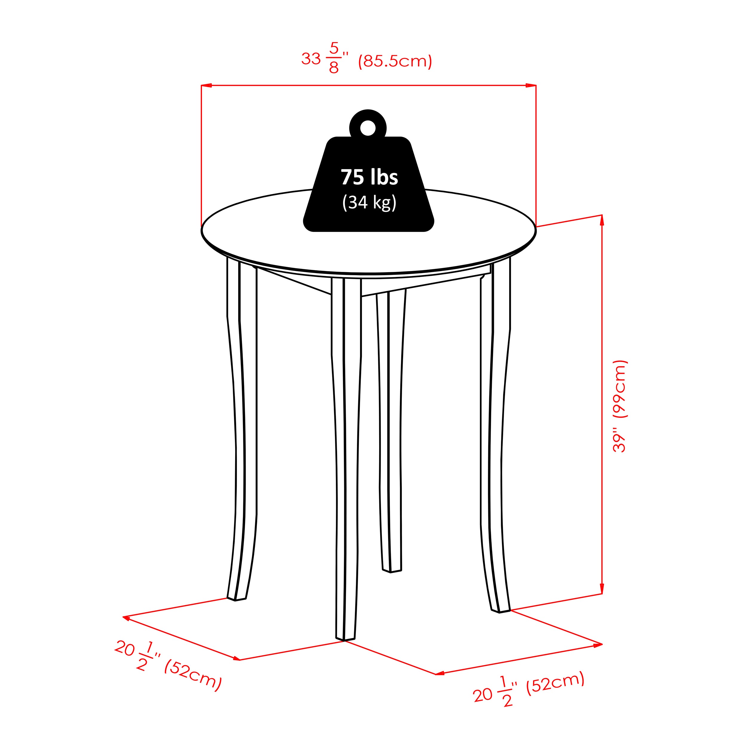 - The round table will accommodate up to four chairs. Table set up size is 33.66"W x 33.66"D x 38.98"H.