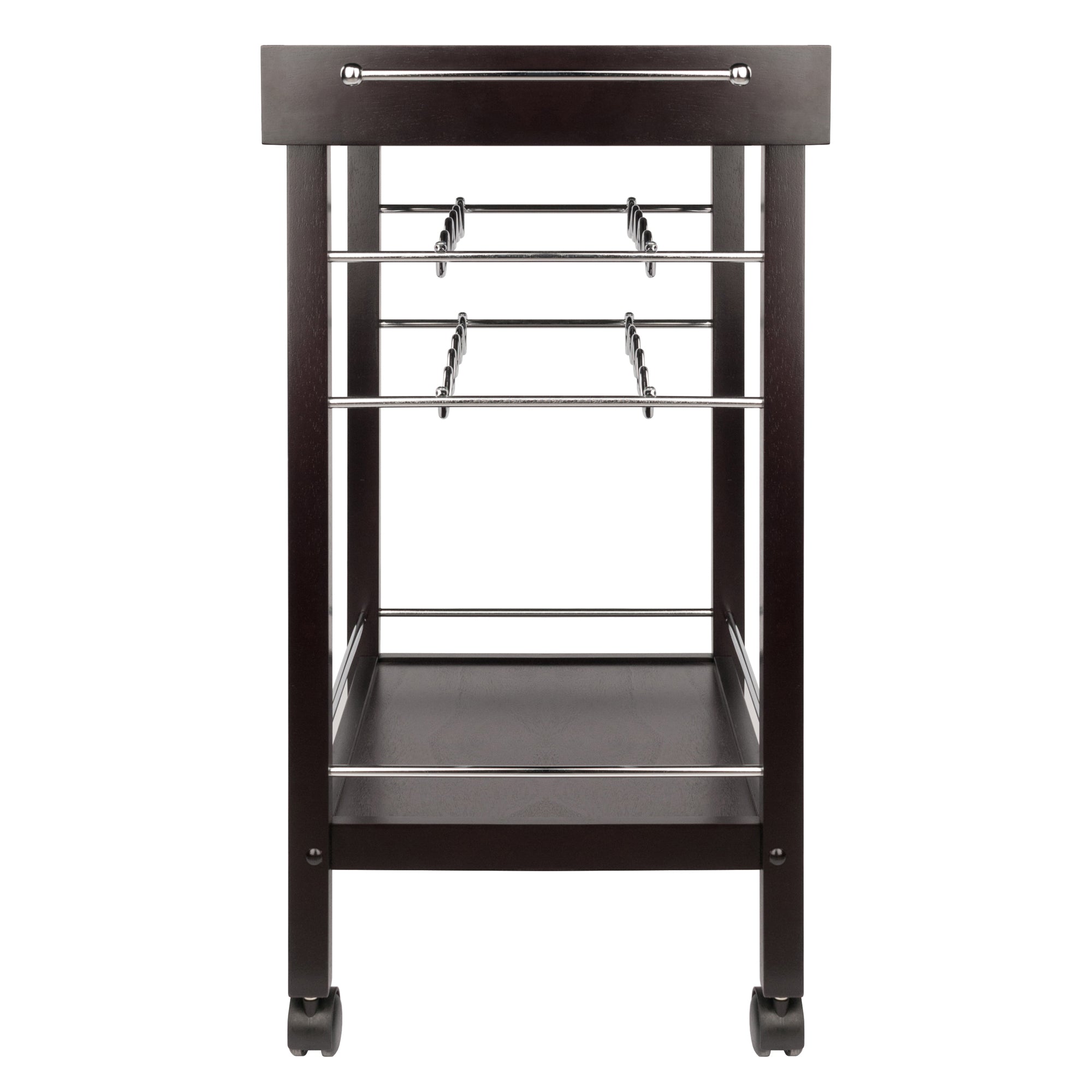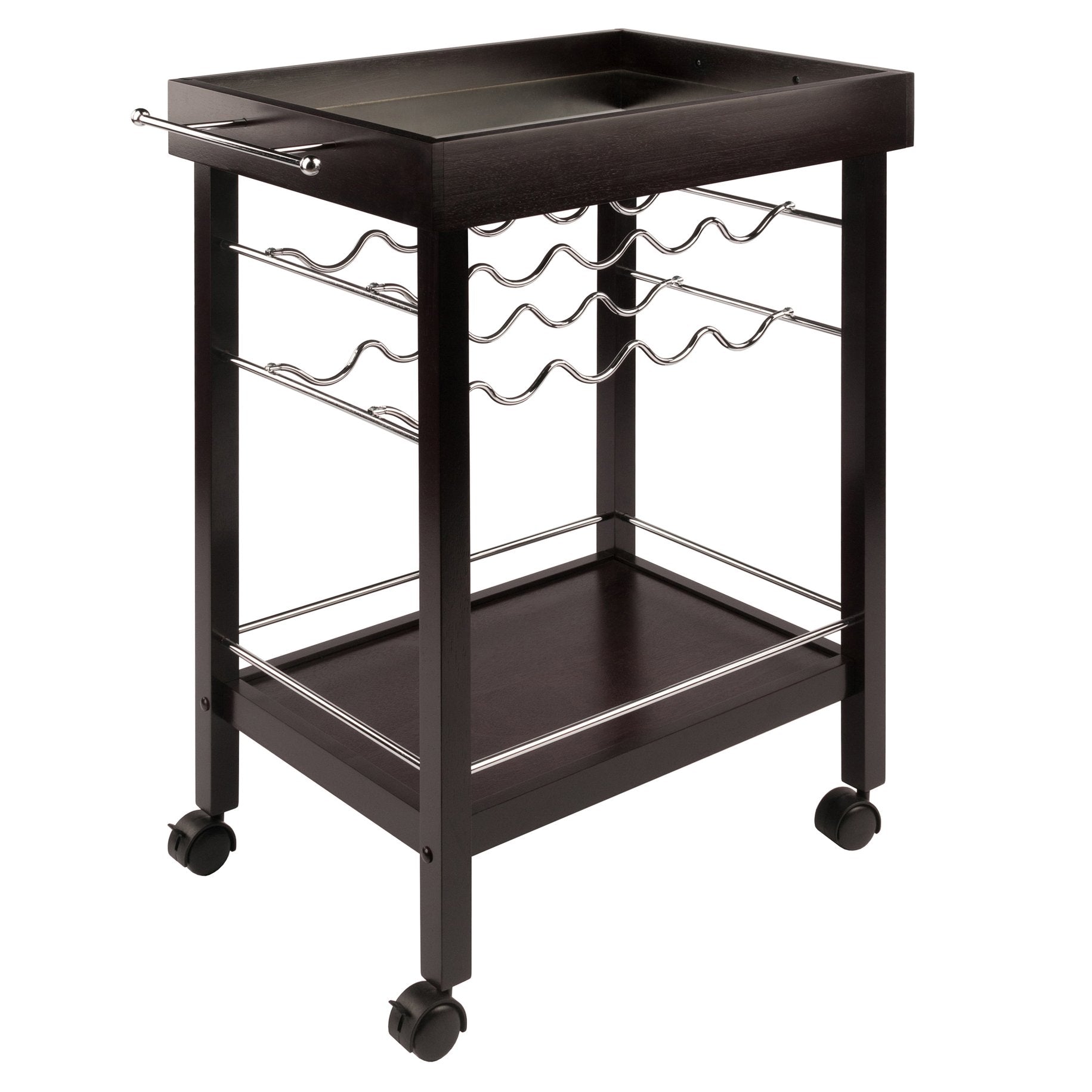 The Johnnie Bar Cart holds everything necessary for a portable bar. Cart Top is mirror reflecting your wares and adds elegant. It can store ten bottles of wine in its upper racks, and also has a lower shelf to hold more bottles and glasses.