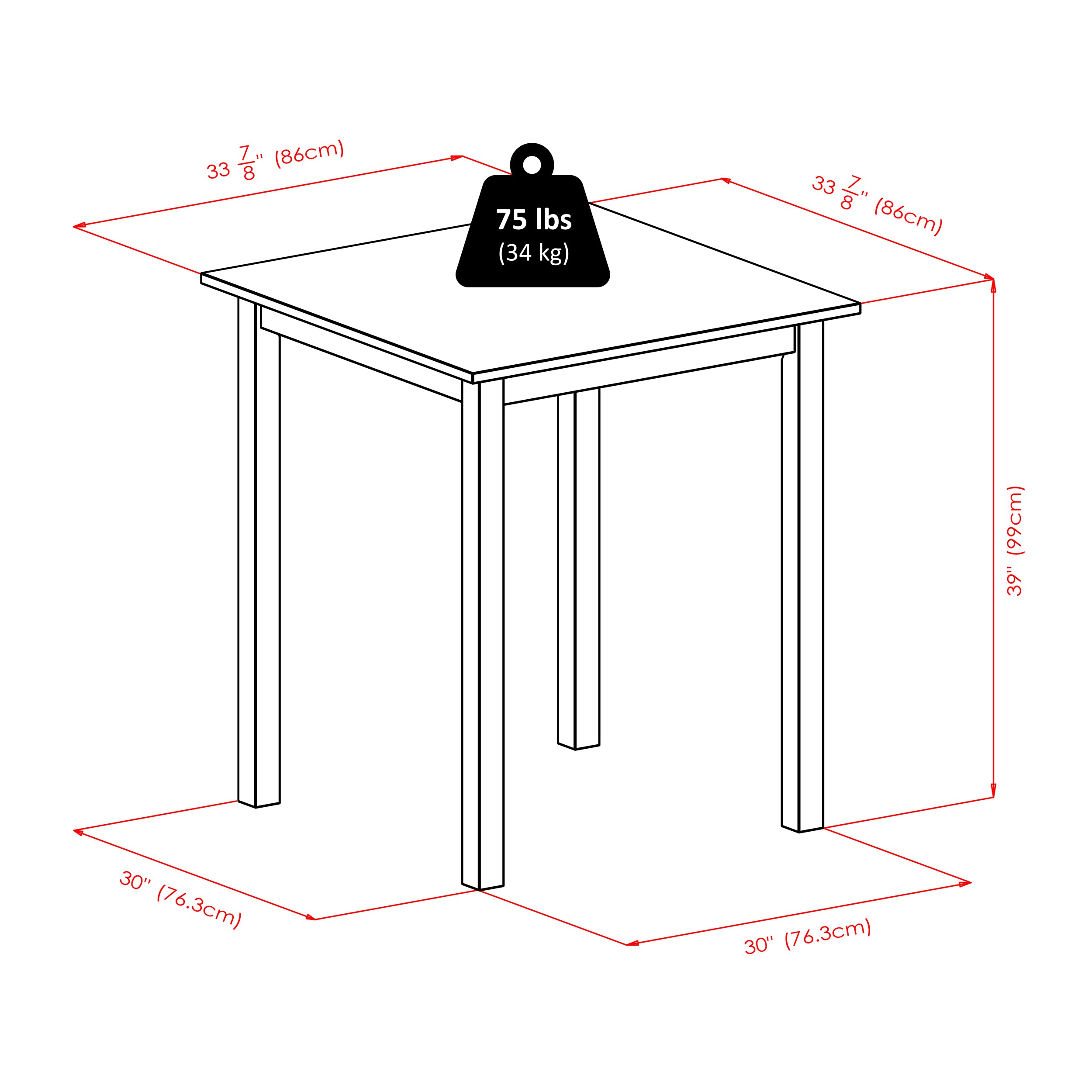 - Square Table assembled size is 33.86"W x 33.86"D x 38.98"H.