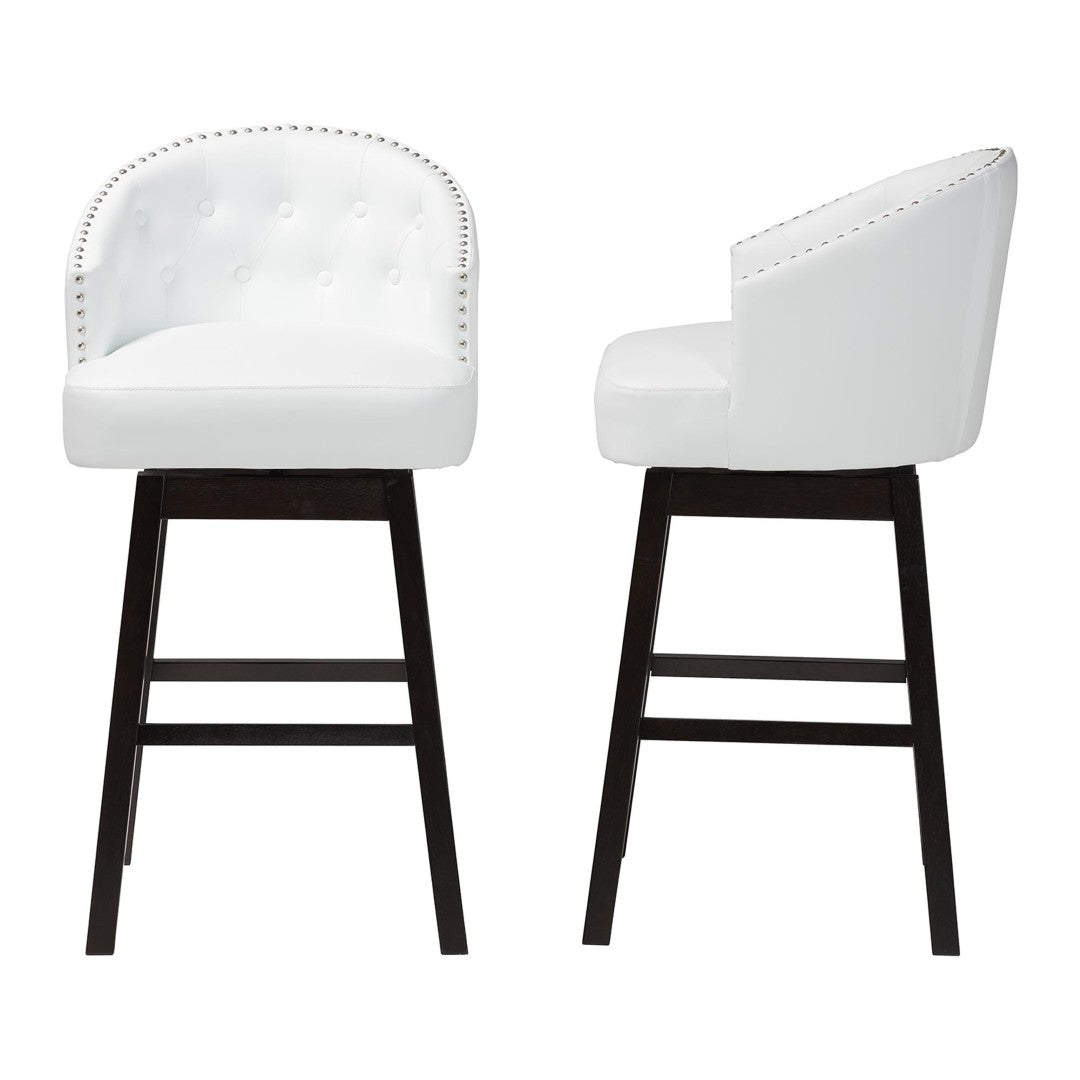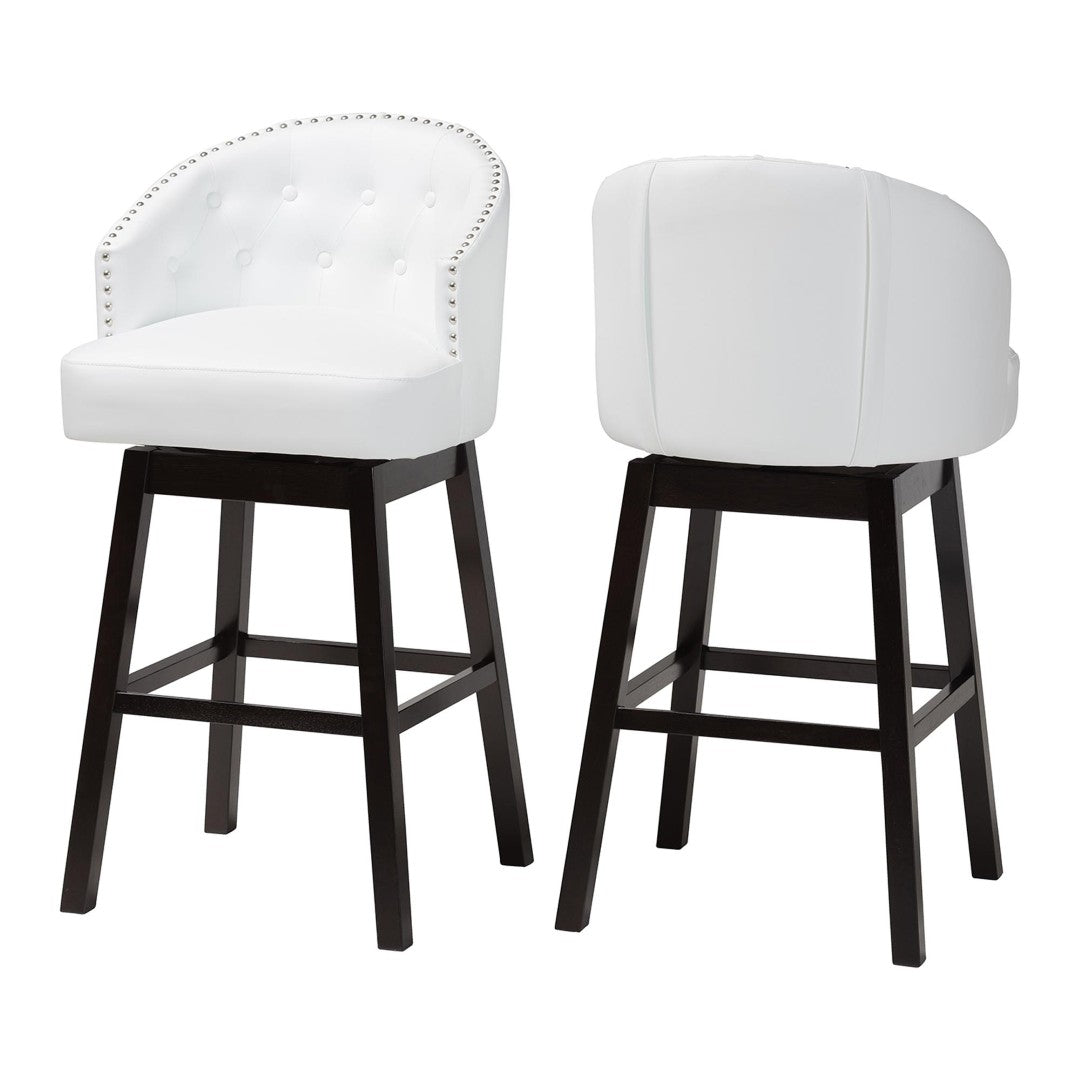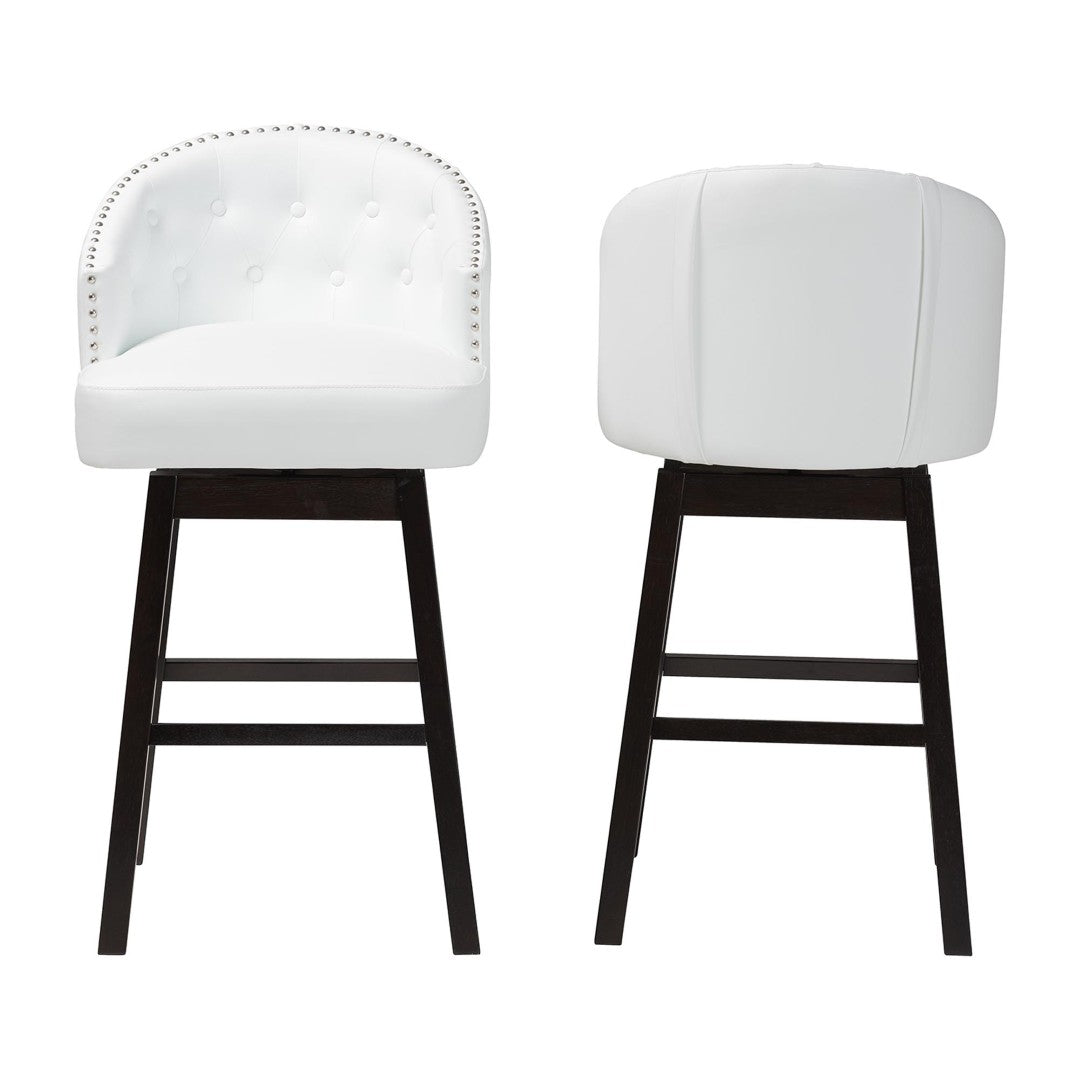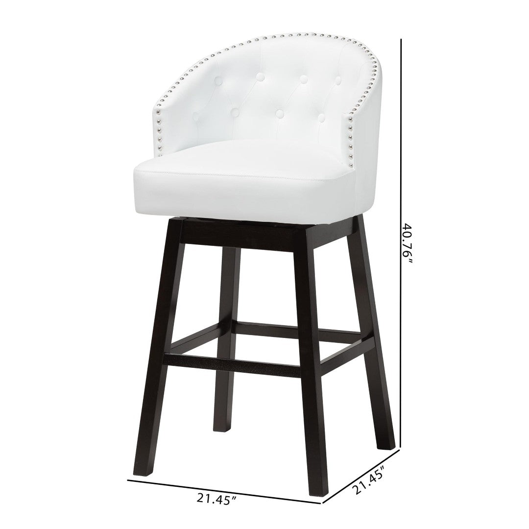 Refresh your bar or counter area with the Avril Swivel Barstool — a refined blend of modern comfort and classic detailing. Fully upholstered in creamy white faux leather with button tufting and silver nailhead trim, this two-piece set offers cushioned seating, smooth 360° swivel action, and a sturdy rubberwood frame finished in dark espresso. Designed for both residential kitchens and hospitality settings, the Avril pairs polished appearance with practical construction and easy assembly.