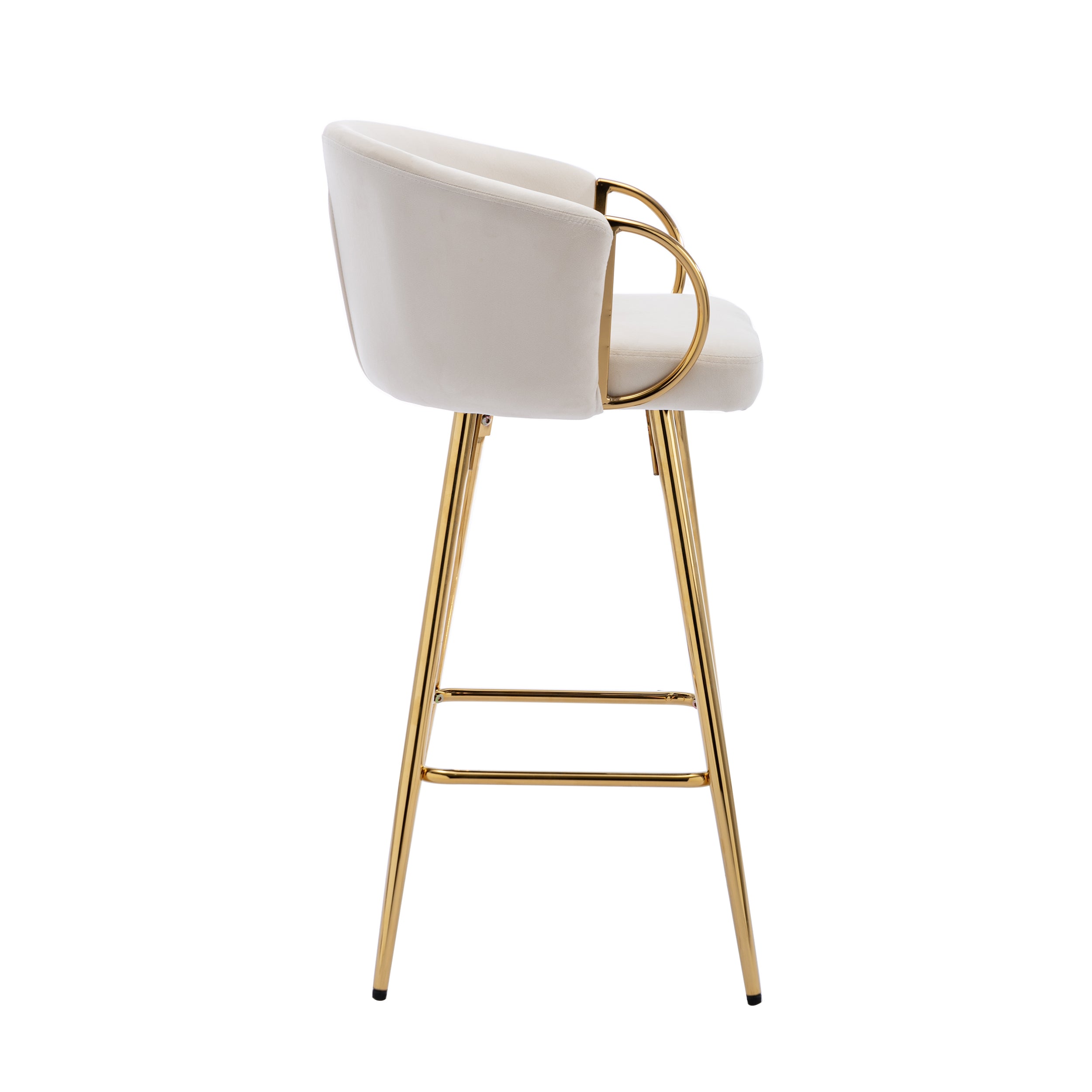 These stylish cream velvet bar stools combine modern elegance with sturdy construction to elevate any kitchen island, home bar, or counter seating area. Plush upholstery and a supportive back offer comfort for long conversations, while the gold legs and chrome footrest add a refined metallic contrast for contemporary decor.