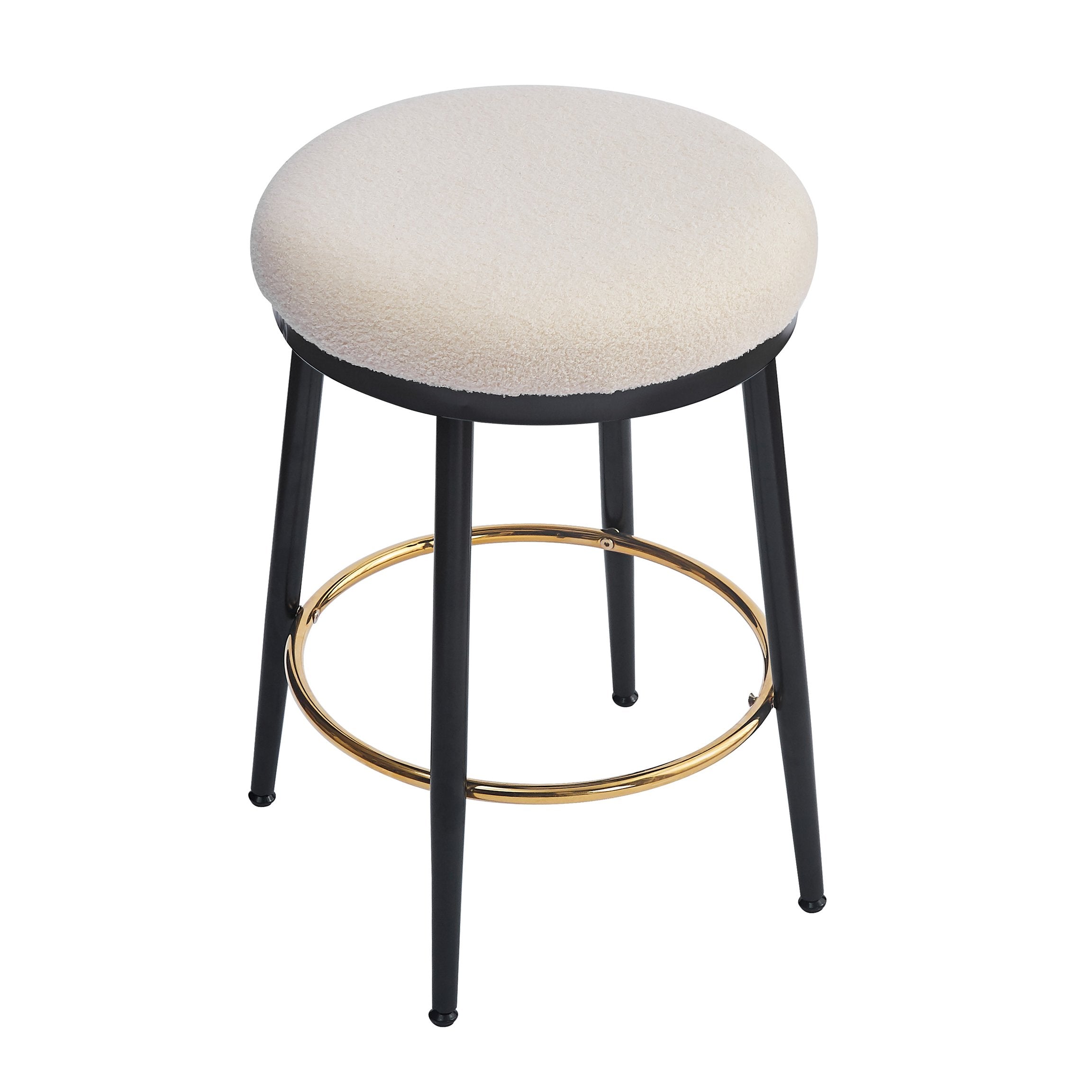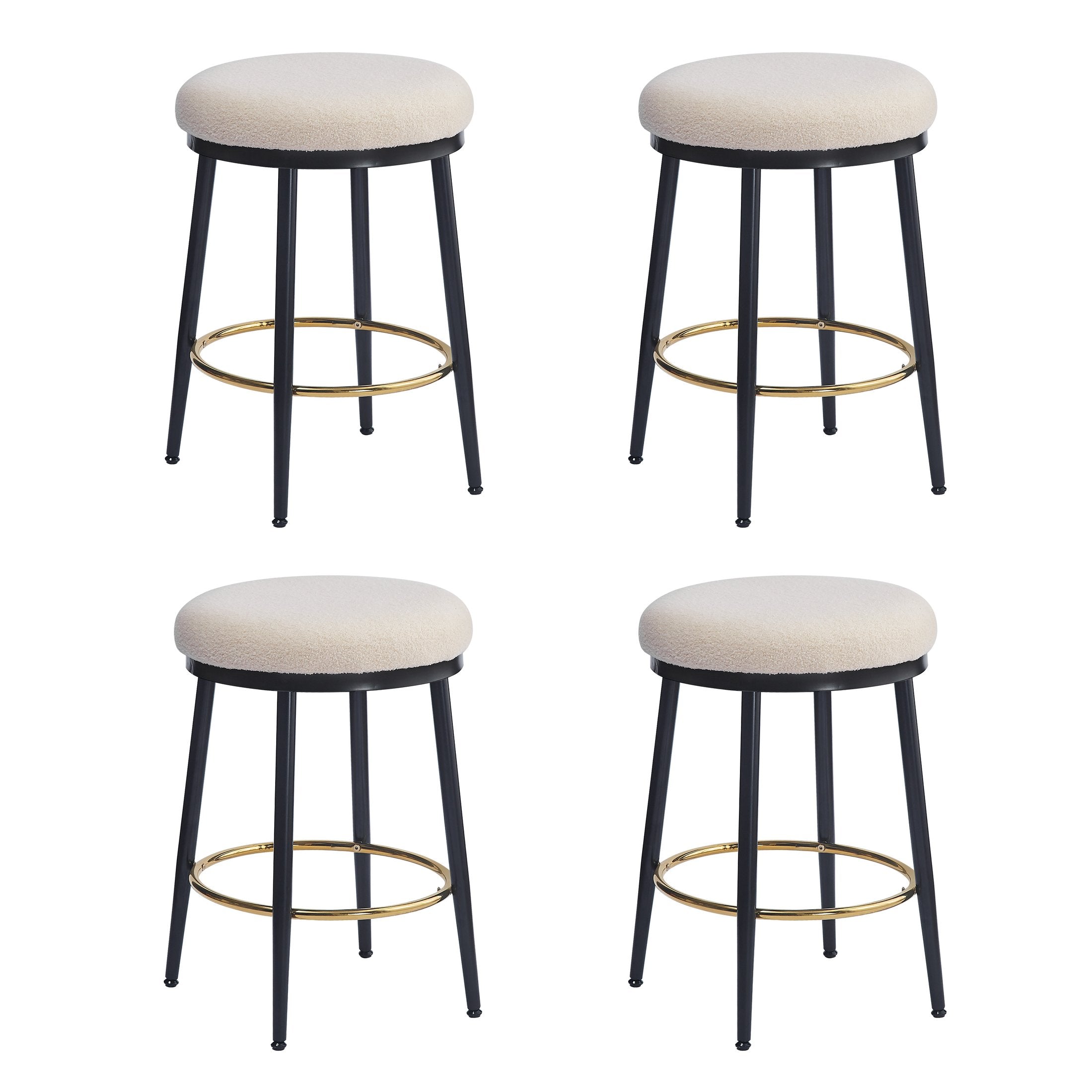 Upgrade your kitchen, dining area, or breakfast nook with this set of four modern backless counter stools that blend sleek design with everyday comfort. Each stool features a plush sponge-cushioned seat wrapped in soft velvet, a sturdy iron frame with a glamorous gold-colored circular footrest, and protective floor adjusters for stable seating on uneven surfaces—ideal for contemporary homes seeking both style and function.