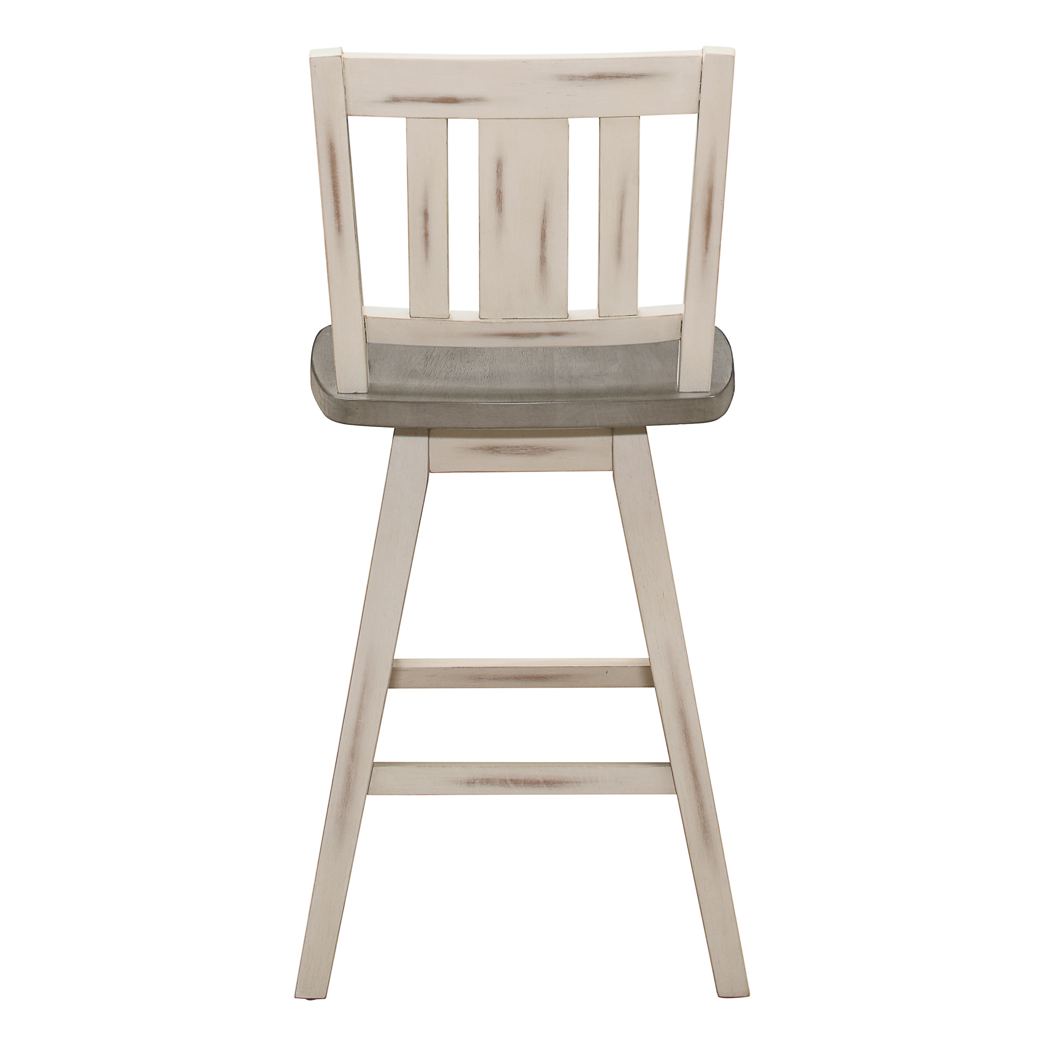 Add a touch of understated rustic charm to your kitchen or breakfast nook with these Amsonia counter-height swivel chairs. Crafted from solid rubberwood with a white sand-through finish, they combine durable construction and everyday comfort—ideal for casual meals, morning coffee, or entertaining guests. The 360-degree swivel base and vertical slat back deliver both functionality and classic style, while the compact footprint fits well in smaller spaces.