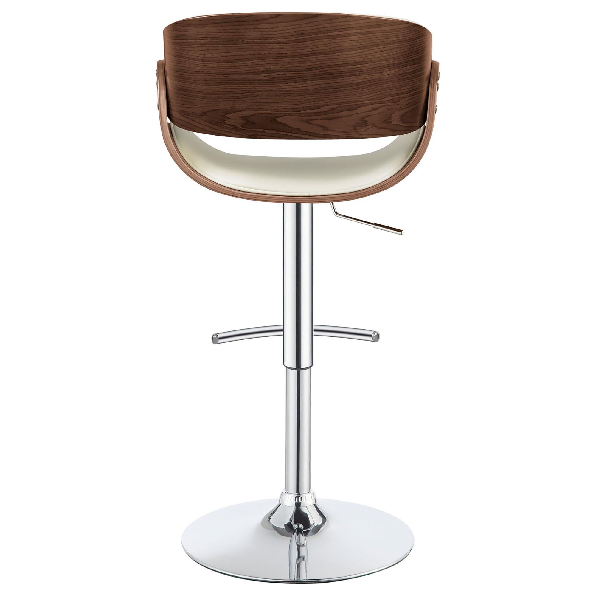 An elegant blend of mid-century form and modern functionality, this adjustable bar stool pairs ecru faux-leather upholstery with warm walnut wood accents and chrome detailing for a versatile look that complements a range of interiors. Designed for comfort and everyday use, the stool offers a supportive back, cushioned seat, and gas-lift height adjustment—making it ideal for kitchen islands, home bars, or contemporary dining spaces.