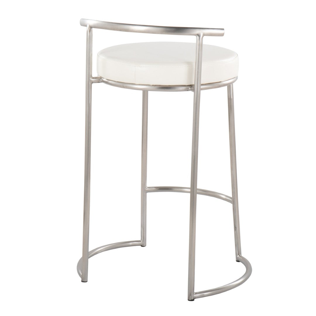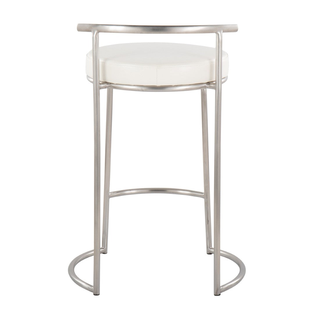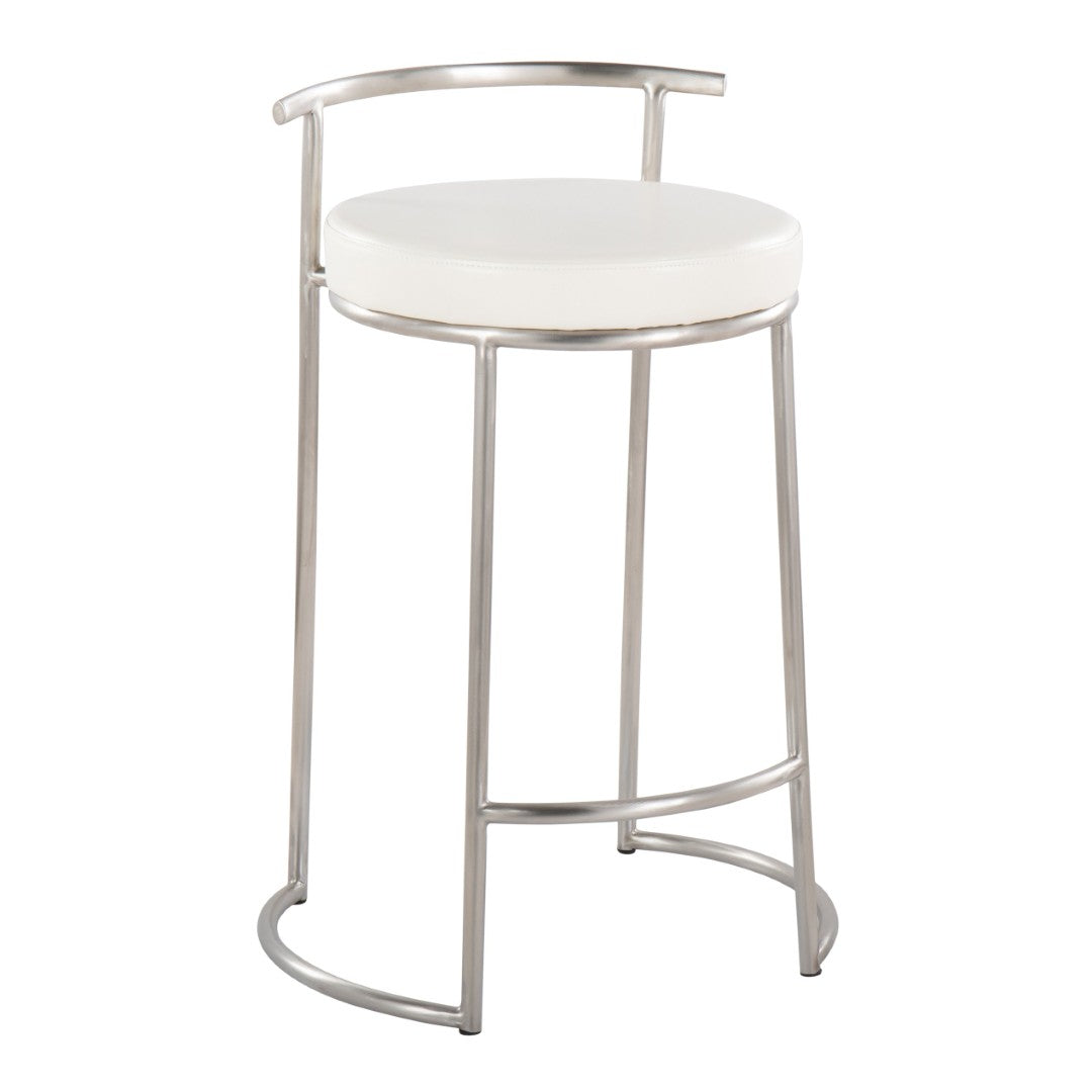 Bring contemporary simplicity and comfortable seating to your kitchen or entertaining area with this pair of Round Fuji counter stools. Clean lines, a rounded backrest and a thick padded seat wrapped in white faux leather provide an elegant, modern look that complements a variety of interiors. Built on a stainless steel frame, these fixed-height stools combine durability with a slim, lightweight profile for easy placement and pairing with any counter.
