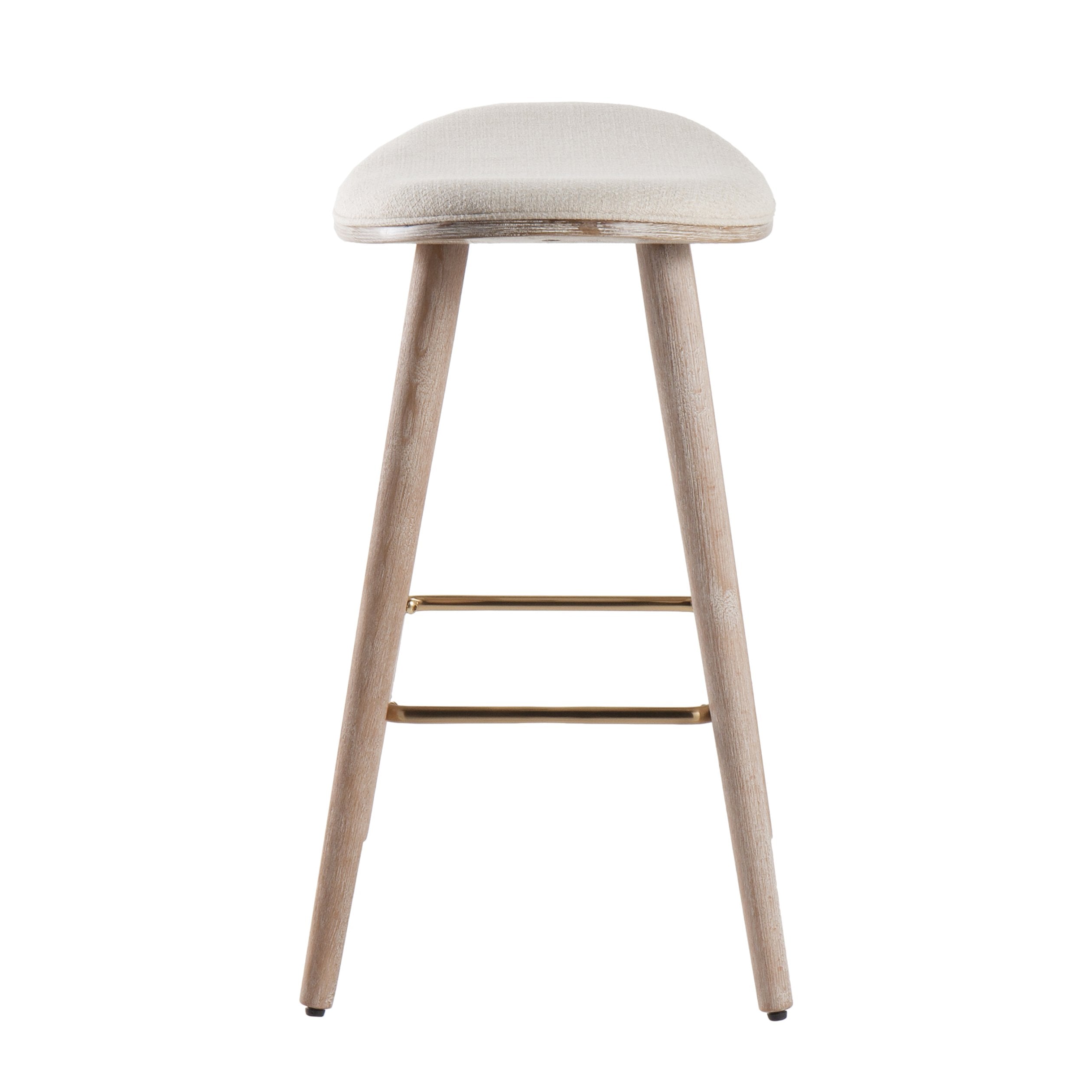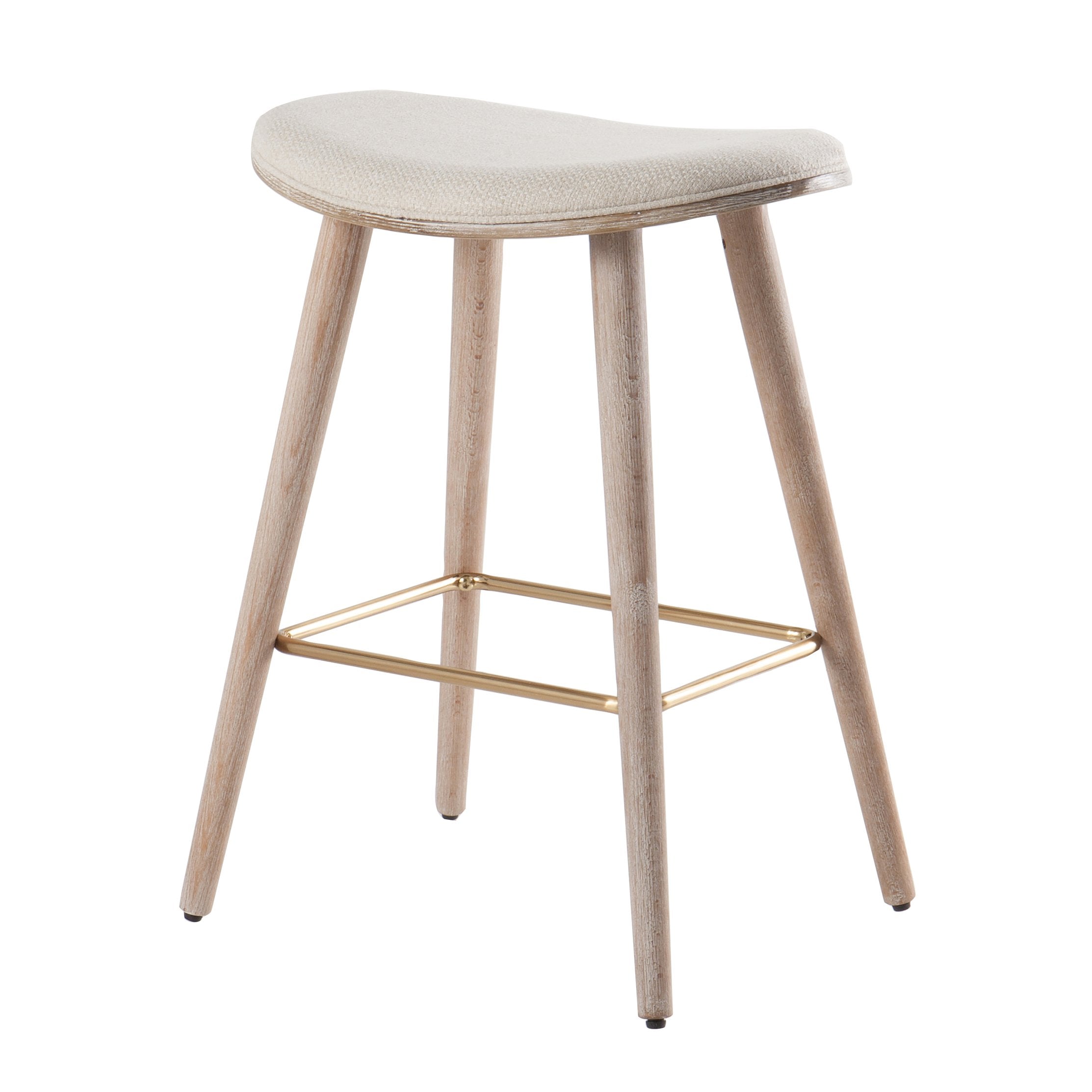 Bring modern comfort to your kitchen or bar with the Saddle Counter Stool by LumiSource. Thoughtfully designed for everyday use, this set of two stools pairs a sculpted, contoured upholstered seat with tapered white-washed wood legs and a gold metal footrest for a refined, contemporary look. Ideal for counter-height surfaces, the neutral cream fabric complements a wide range of décors while providing supportive seating for casual meals, entertaining, or working.