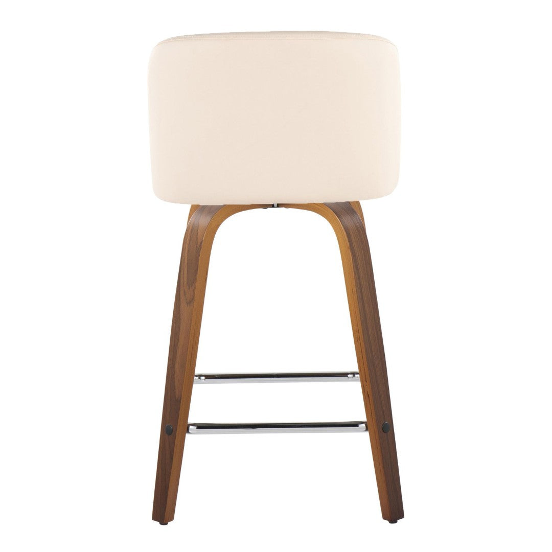 Bring mid-century modern warmth and everyday comfort to your kitchen or counter-height island with the Toriano counter stool. This set of two combines classic bent walnut-look wood legs and a cream faux-leather upholstered seat with a practical 360° swivel and built-in square chrome metal footrest — ideal for casual dining, home bars, or breakfast nooks.