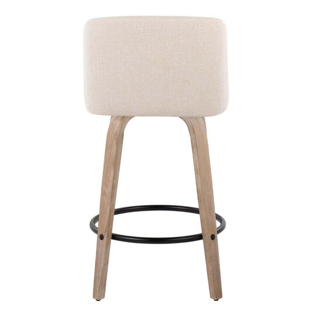 Add mid-century warmth and everyday comfort to your kitchen or bar area with these elegantly simple counter stools. The Toriano design blends farmhouse charm with modern lines—featuring a cushioned, swivel seat and sculpted white-washed wood legs with a contrasting round black metal footrest—making them a versatile, stylish choice for casual dining or entertaining.