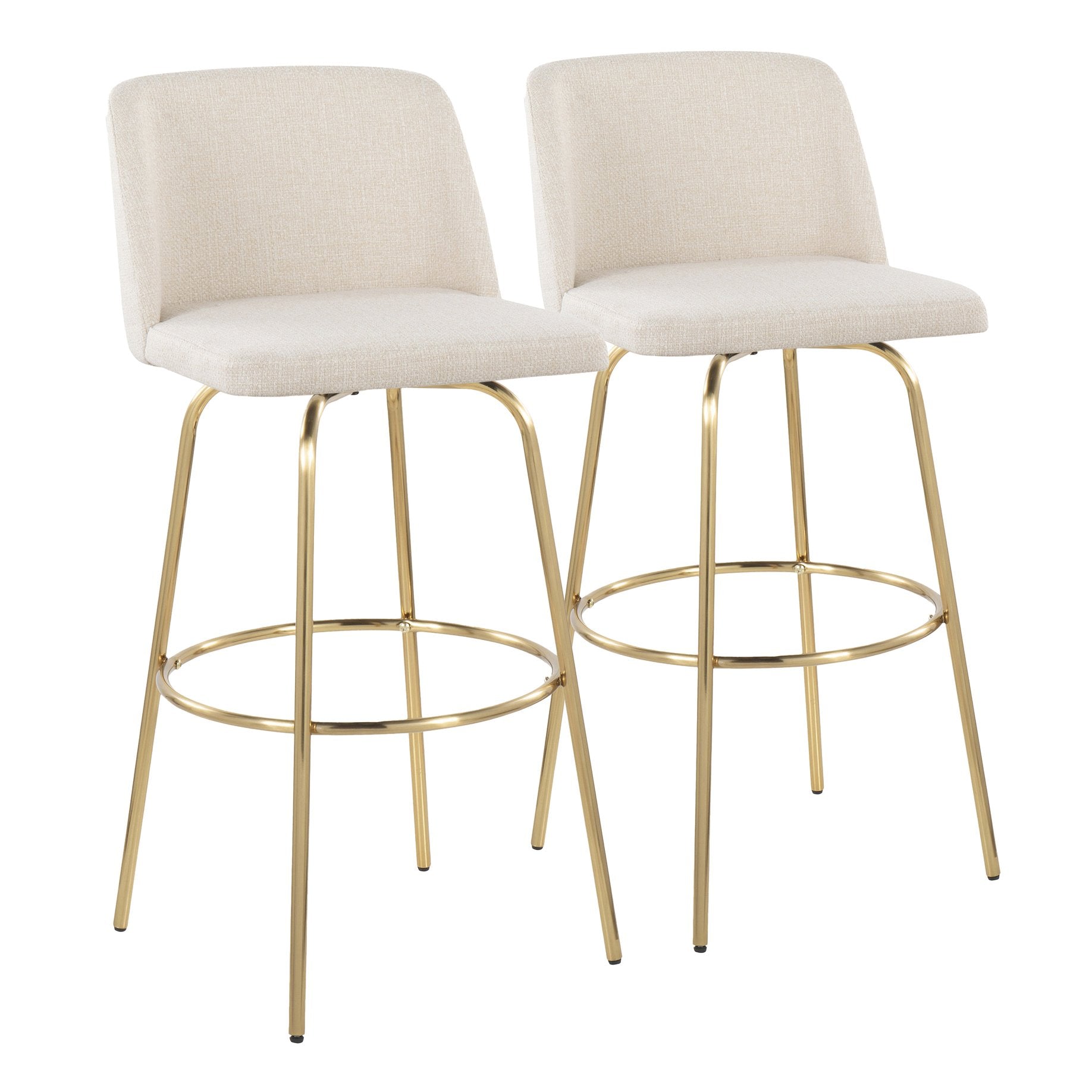 Bring modern elegance and everyday comfort to your bar, kitchen island, or entertainment area with this set of two Toriano barstools. Each stool pairs a softly upholstered cream fabric seat with sleek gold metal legs and a round footrest, offering a refined silhouette that fits contemporary and transitional interiors. The fixed-height design with 360° swivel makes these stools practical for conversation and quick seating, while the padded back and seat keep guests comfortable.