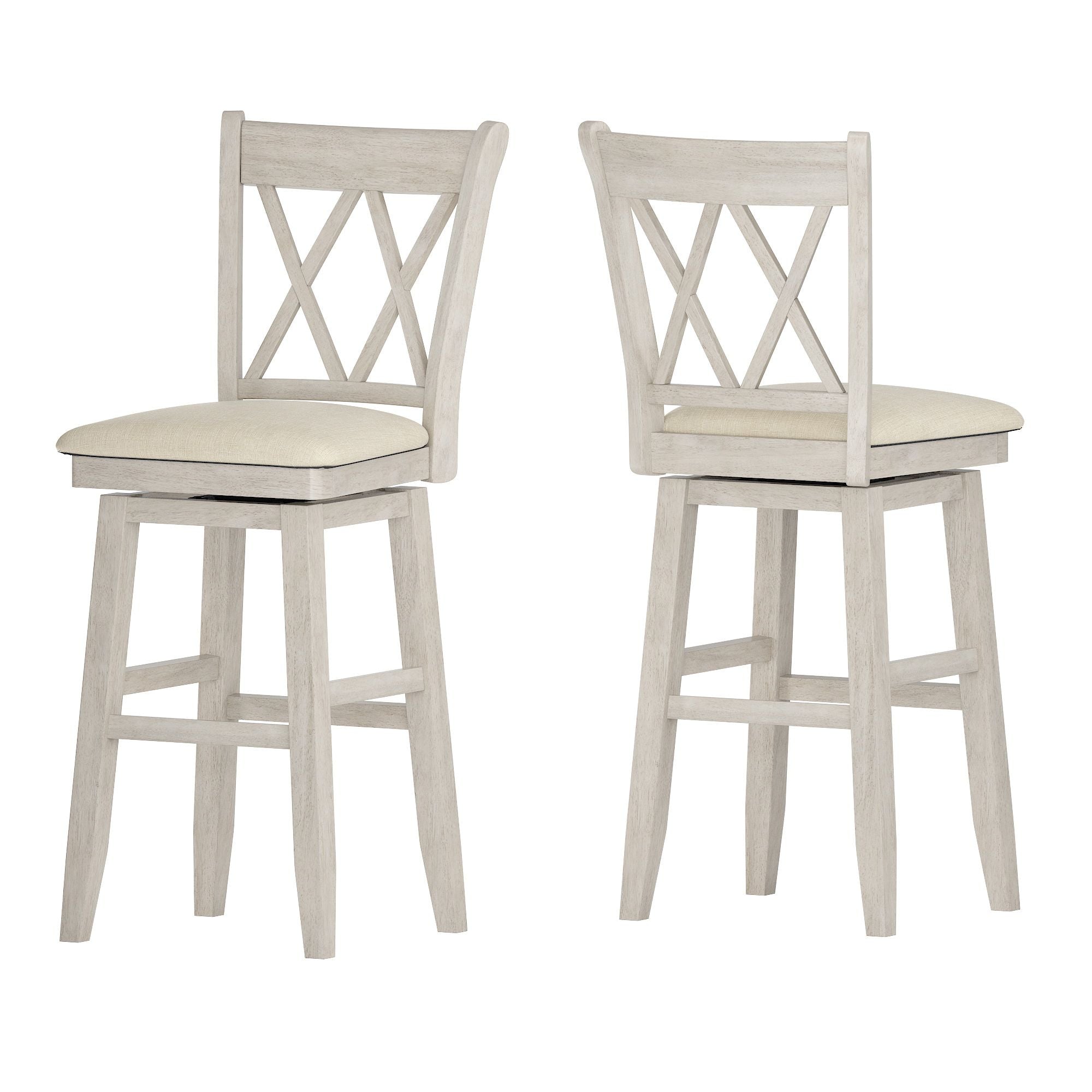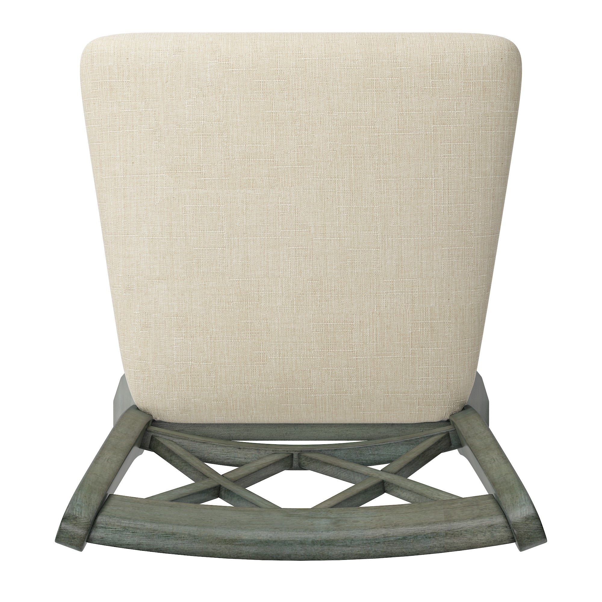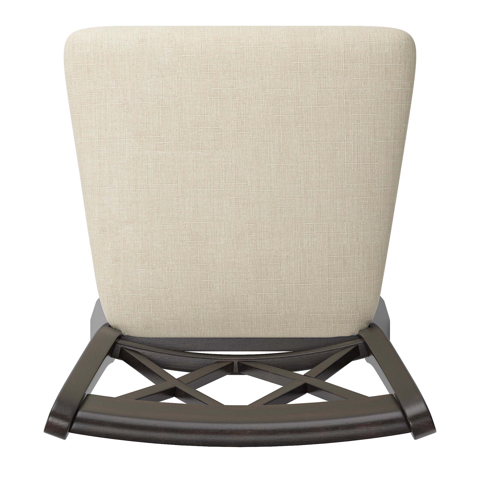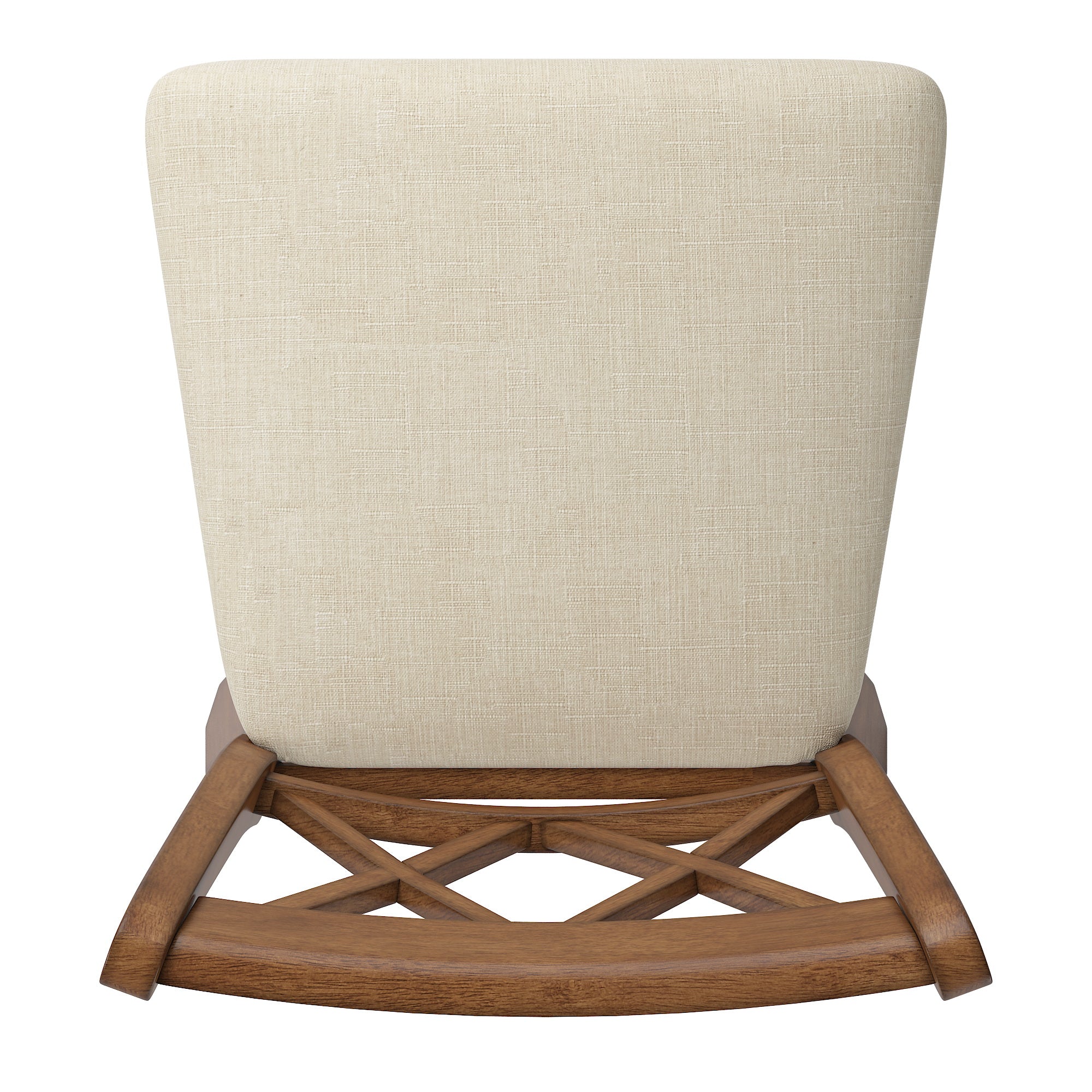- Includes a padded seat, beige fabric upholstery, and a footrest for added comfort