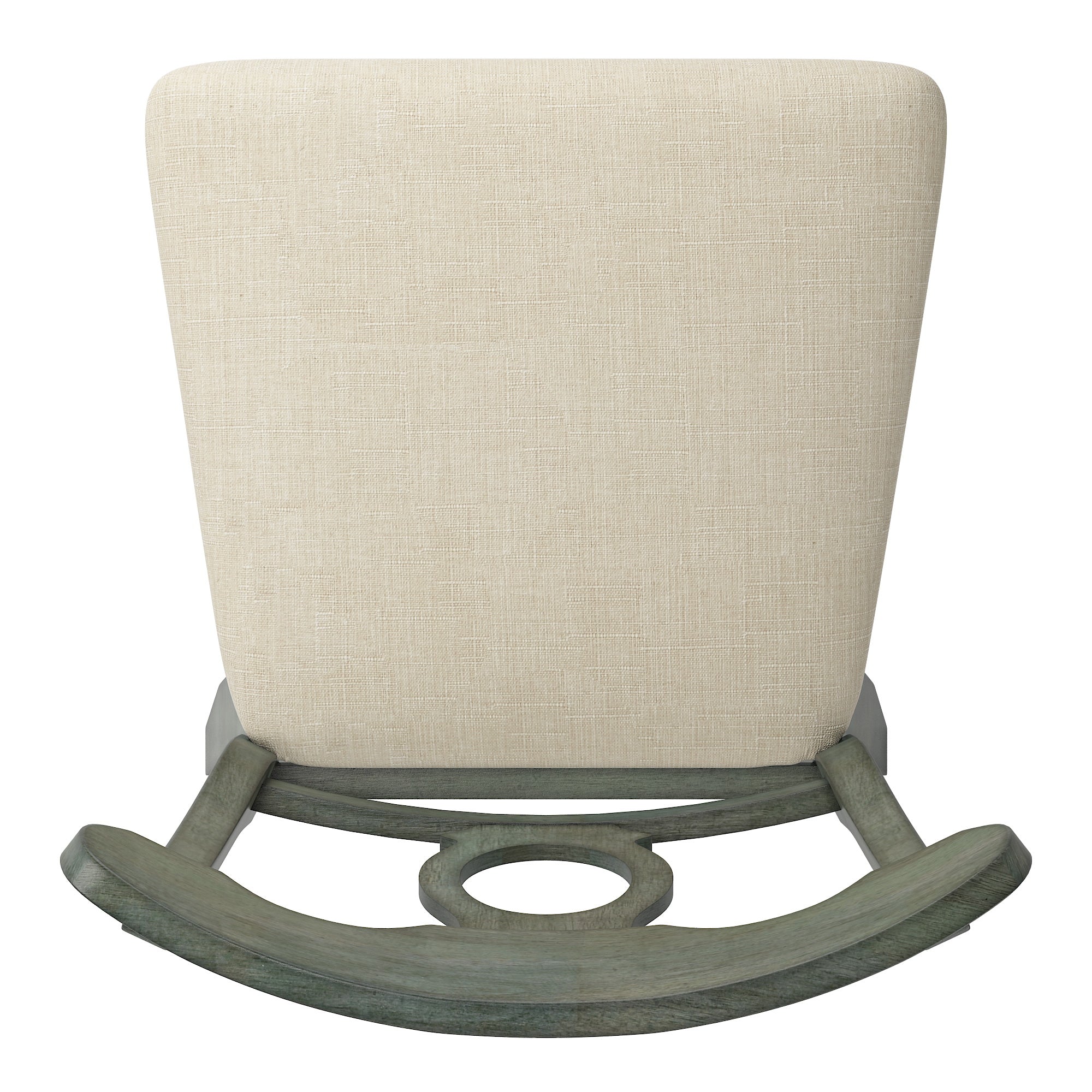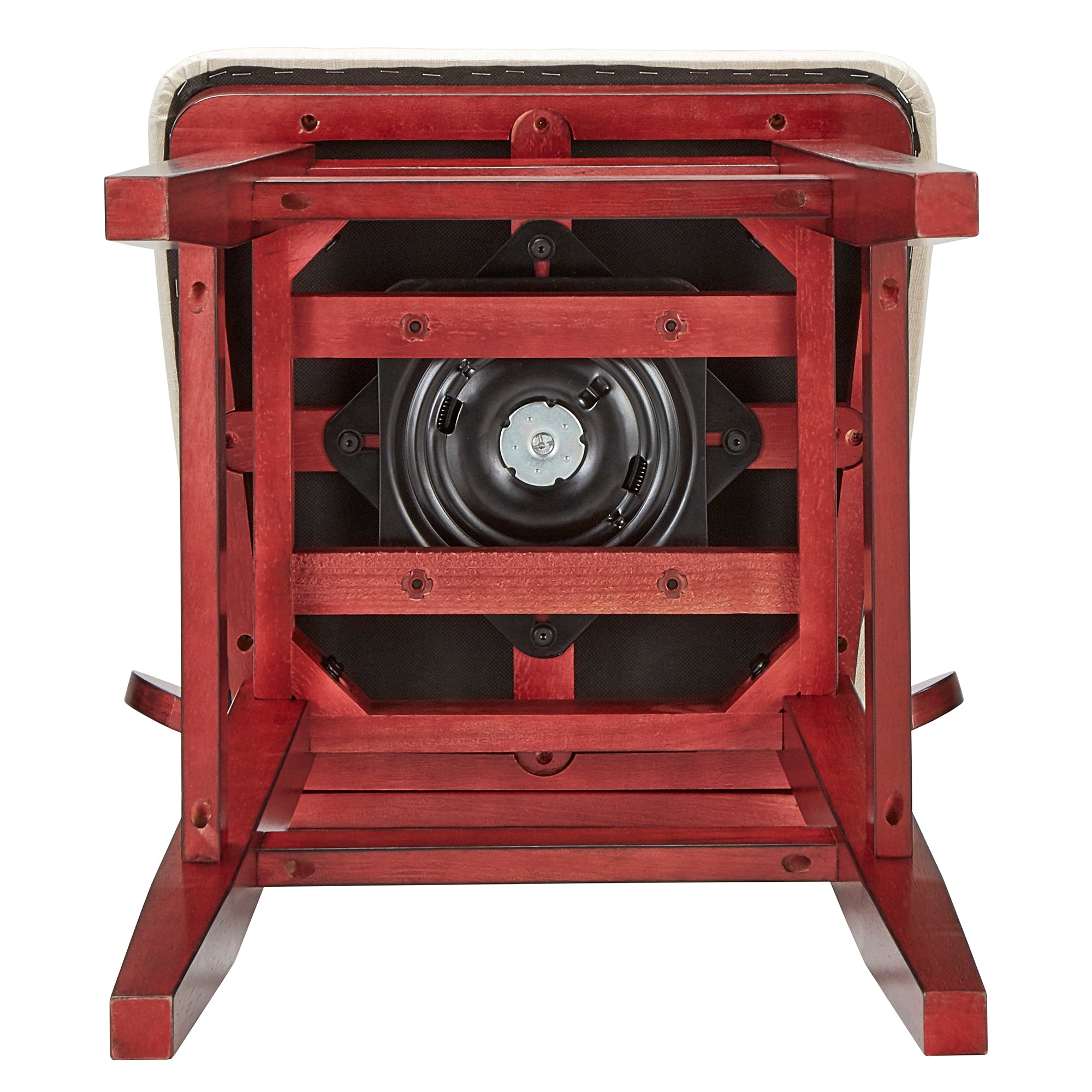 - Features a padded seat, beige fabric upholstery, and footrest for added comfort
