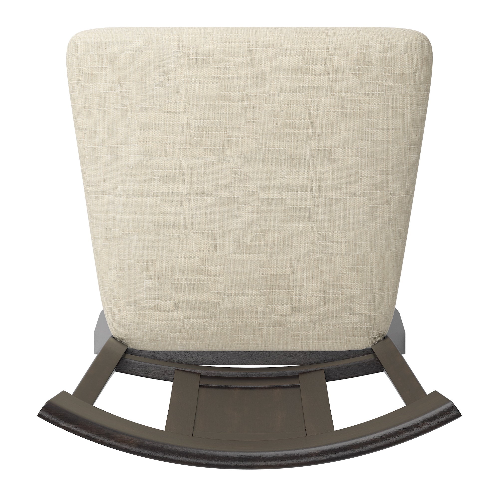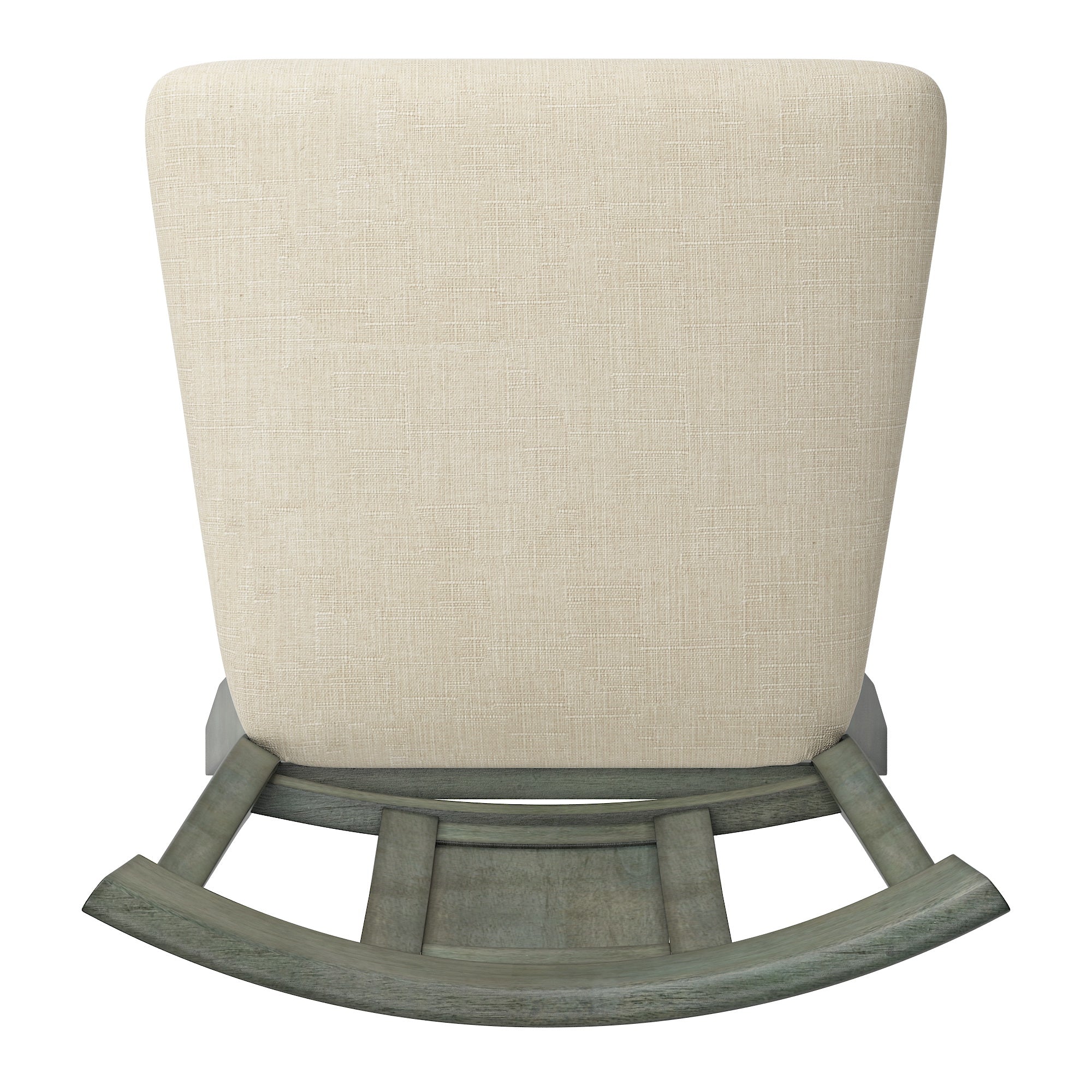 - Foam padded seat, beige fabric upholstery, and footrest for added comfort