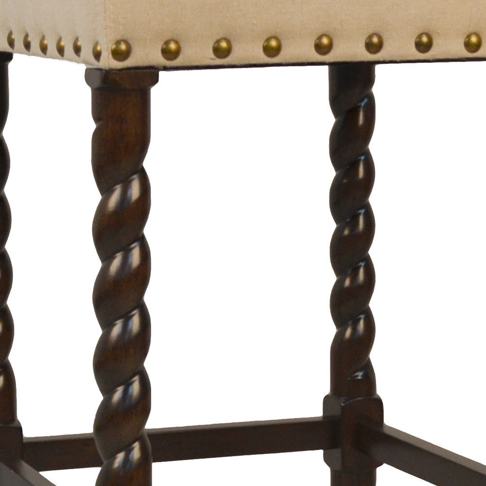 - Features turned/twisted wood legs and a thick and comfy linen/cotton blend upholstered seat.
