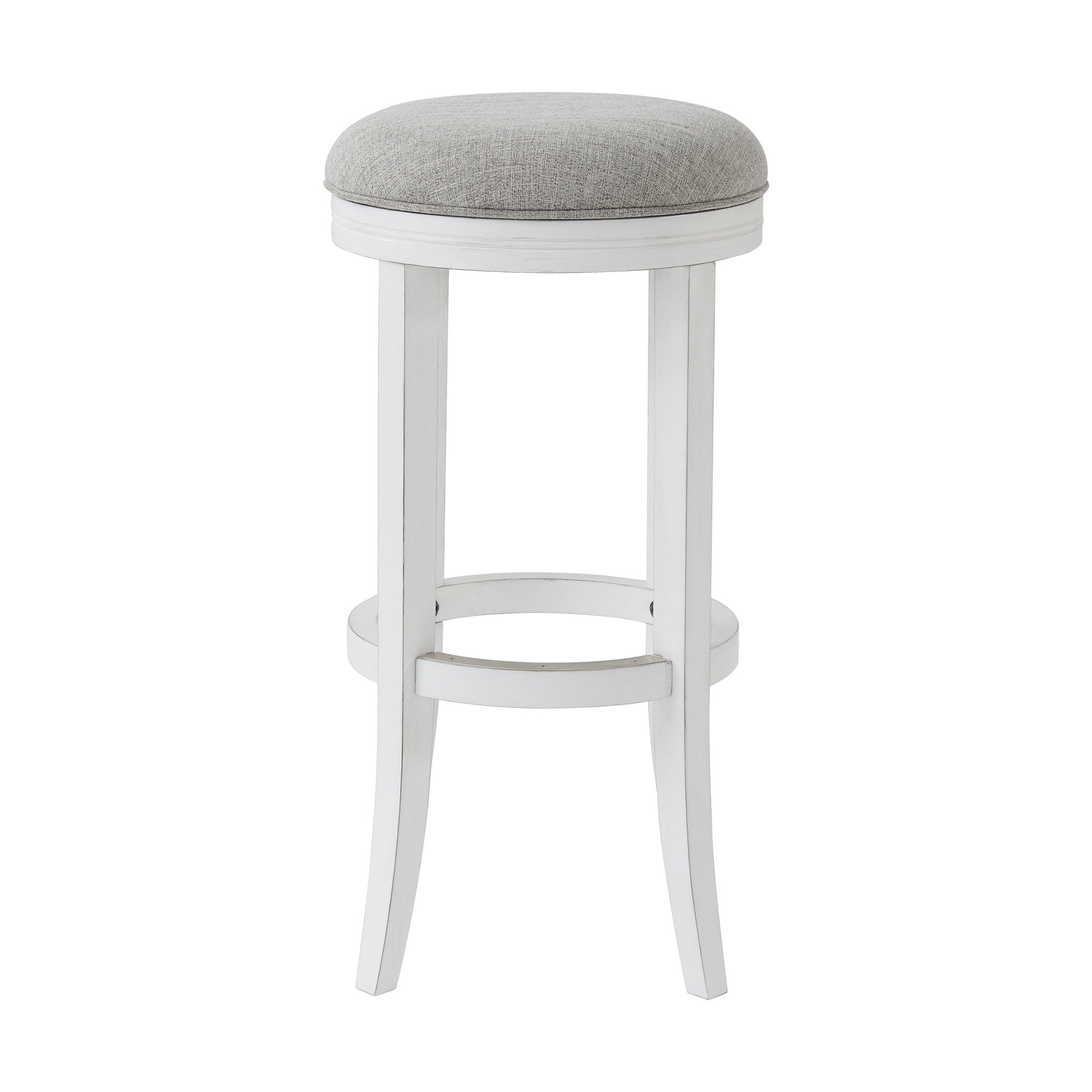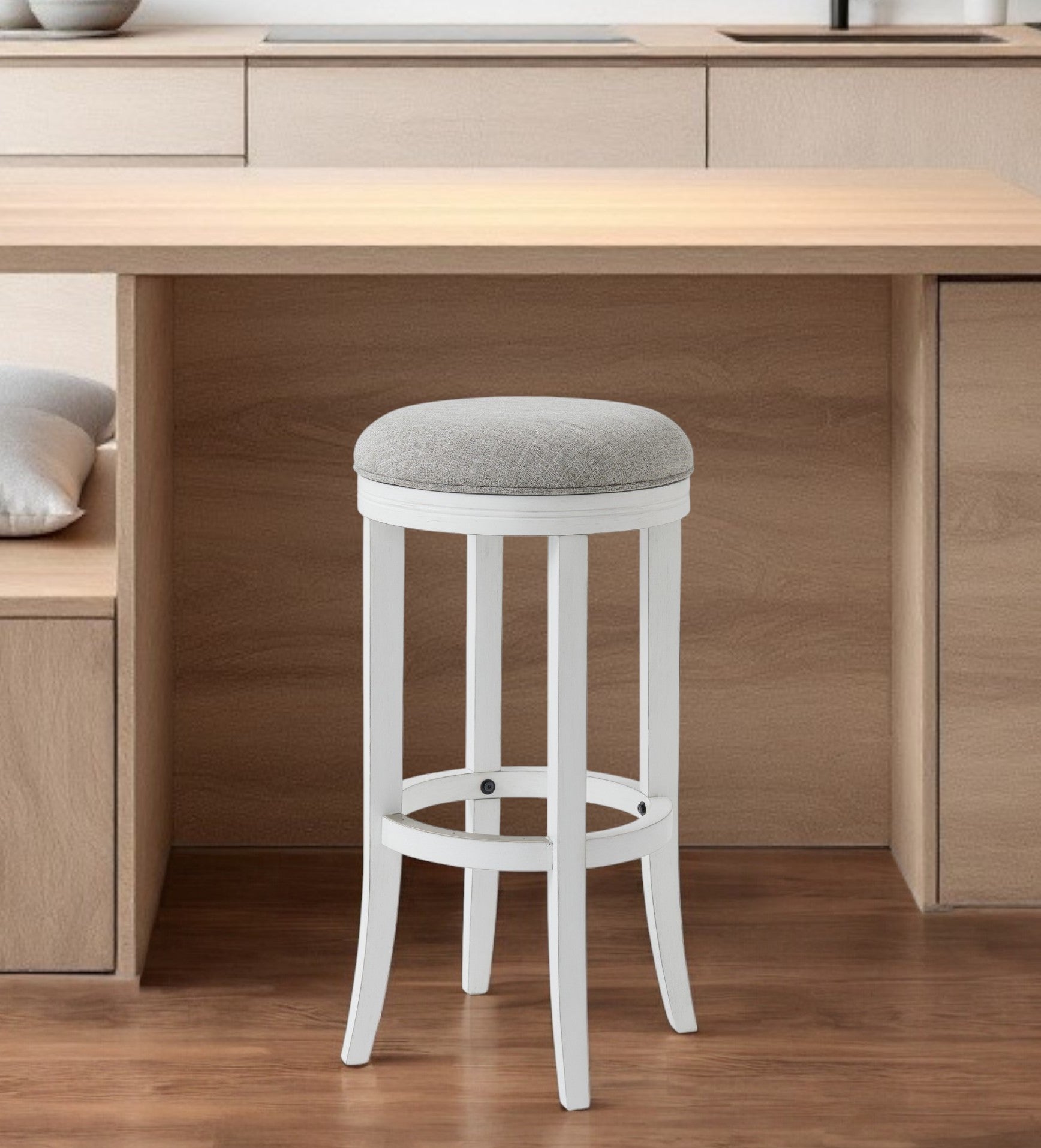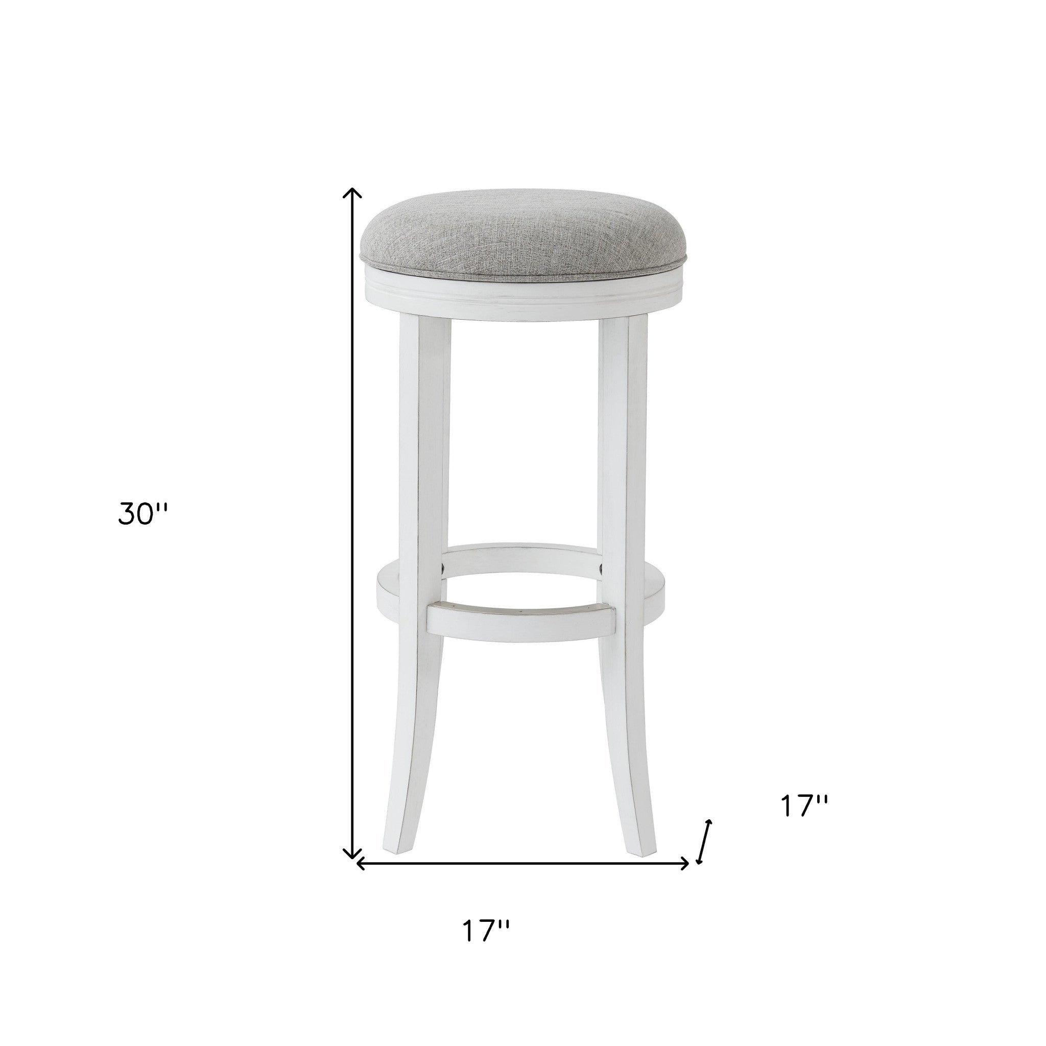 - Features a pleasing two tone coloration with a white wood base and gray upholstered fabric seat.