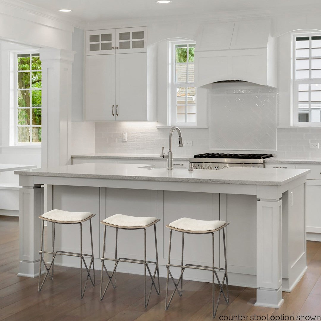 Bring contemporary elegance and comfortable support to your counter-height seating with this refined saddle-seat stool. Upholstered in plush cream fabric and anchored by a sturdy antiqued-gold metal frame, it blends modern lines with a luxe European sensibility—ideal for kitchens, breakfast nooks, or stylish bar areas. Delivered fully assembled for immediate use.