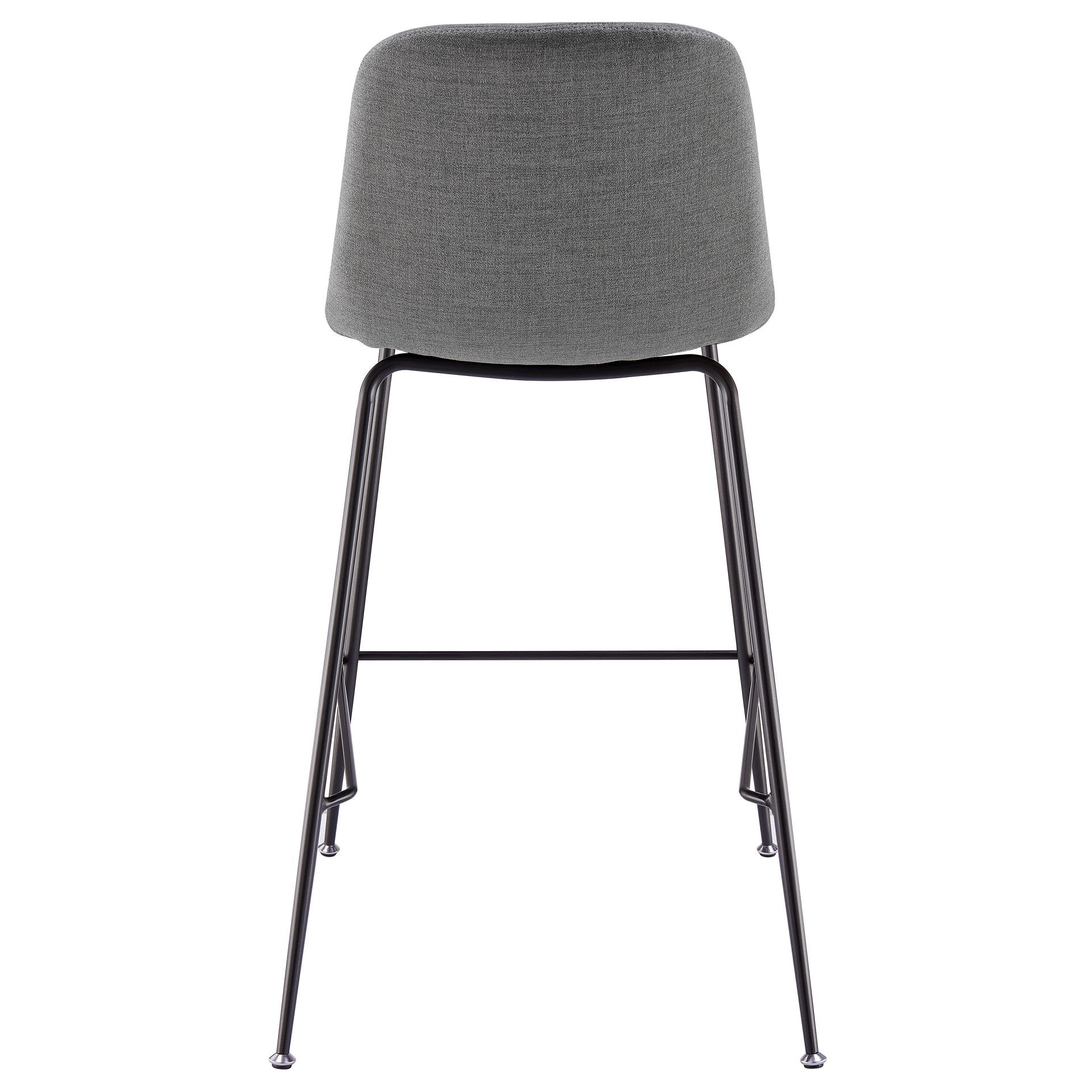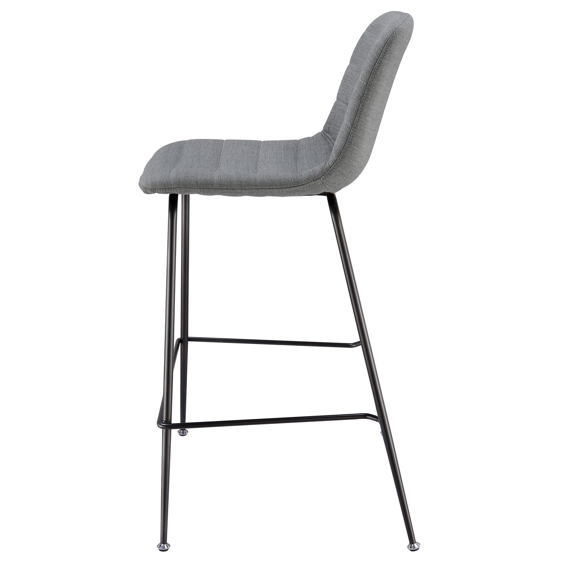 - Feature 1: 36" counter stool in sleek and simple Mid-Mod profile, features modern appeal channel tufting upholstery in Gray on slim powder coated metallic gunmetal color legs. Includes foot stretcher for comfort and sturdiness.