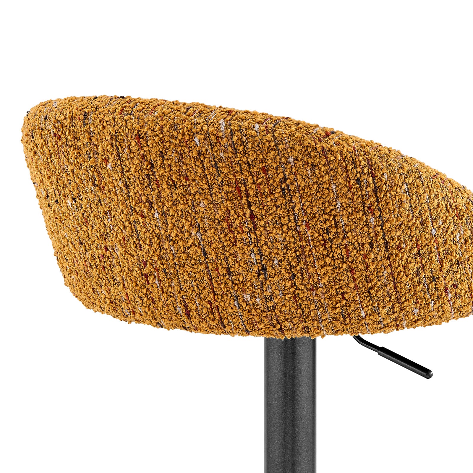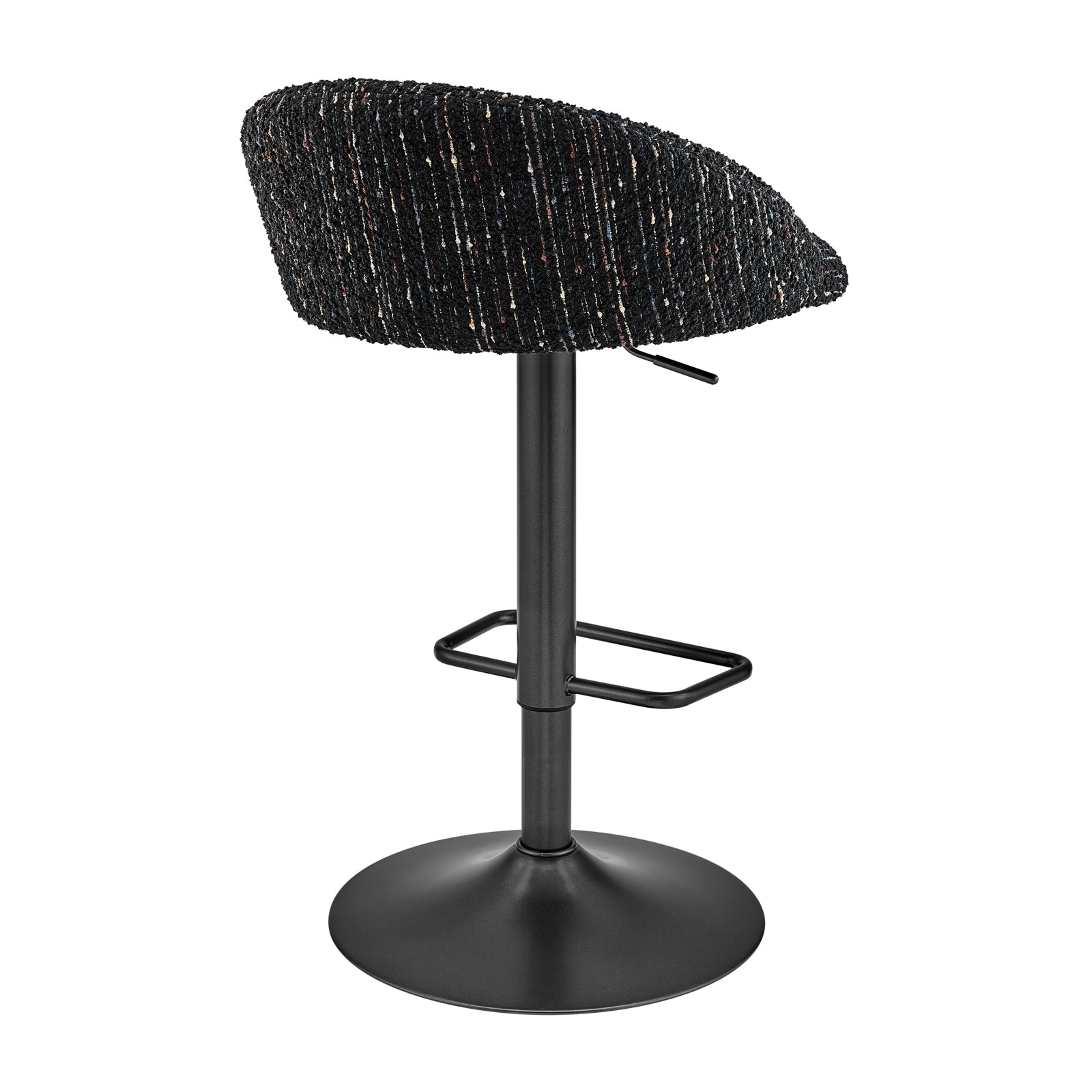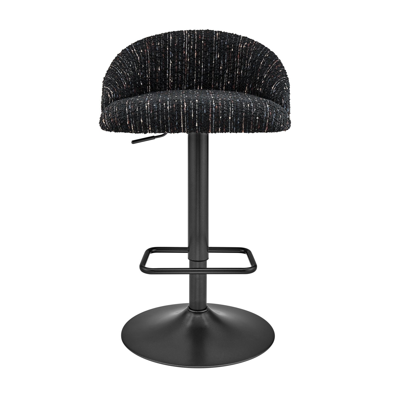 - All time favorite Mid-Century Modern bar stool featuring a channel-tufted back and plush cushioning upholstered in chic soft fabric. Its height is adjustable between 25.5" to 34", and it swivels a full 360 degrees. The square footrest on the pedestal frame provides both comfort and safety.