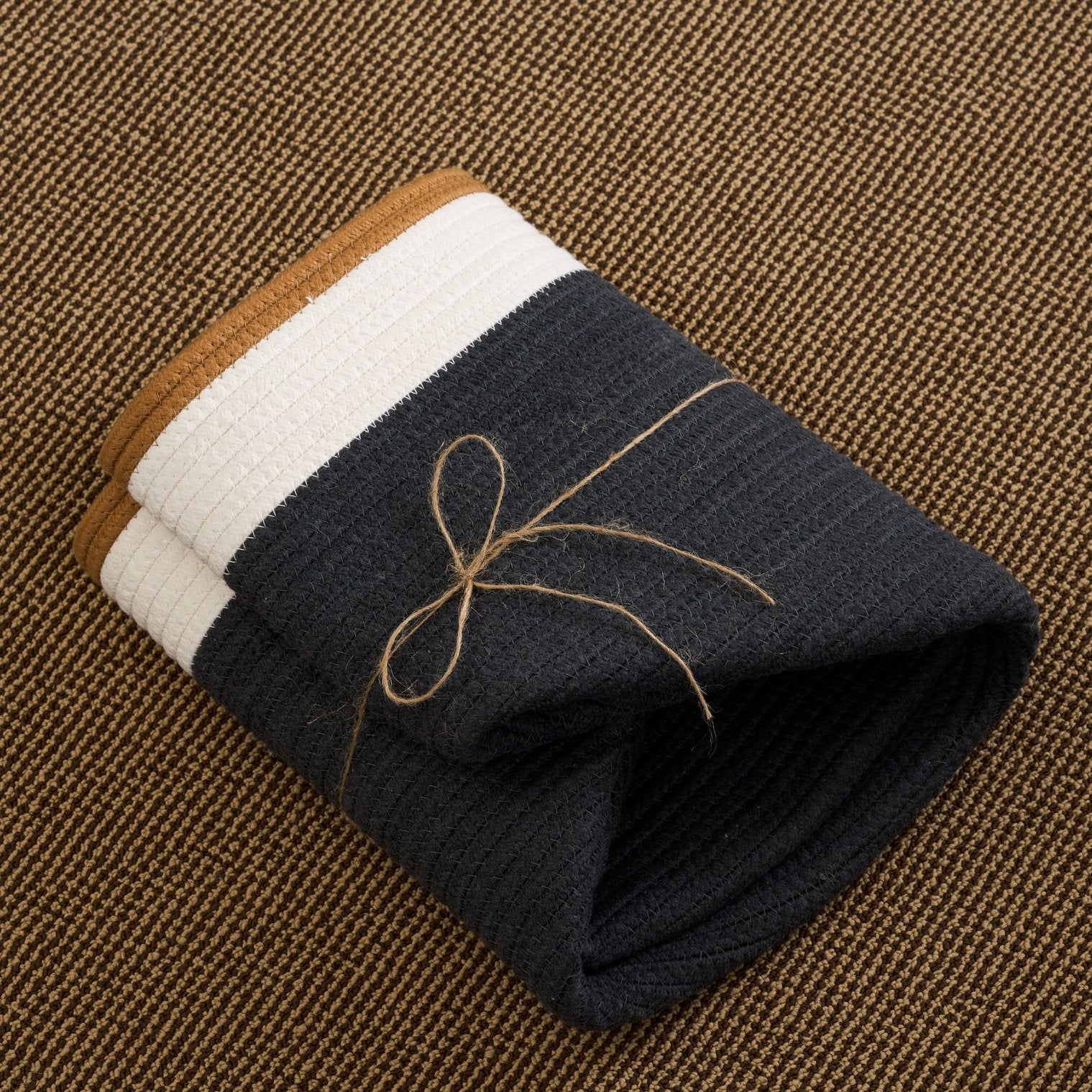 Keep laundry, toys, or extra blankets organized with this stylish round cotton storage basket. Its neutral white-and-brown palette and soft, durable cotton construction make it a versatile accent for bedrooms, bathrooms, nurseries, or living rooms—combining practical storage with a clean, modern look.