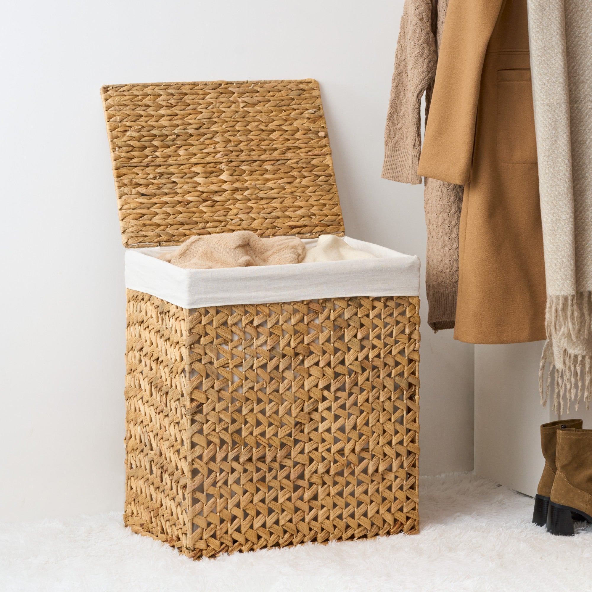 This handcrafted water hyacinth laundry hamper blends rustic charm with practical design, making it an attractive and functional addition to bathrooms, bedrooms, or laundry rooms. Its woven wicker construction provides durability while the curved lid and rectangular profile offer easy access and neat storage for laundry.
