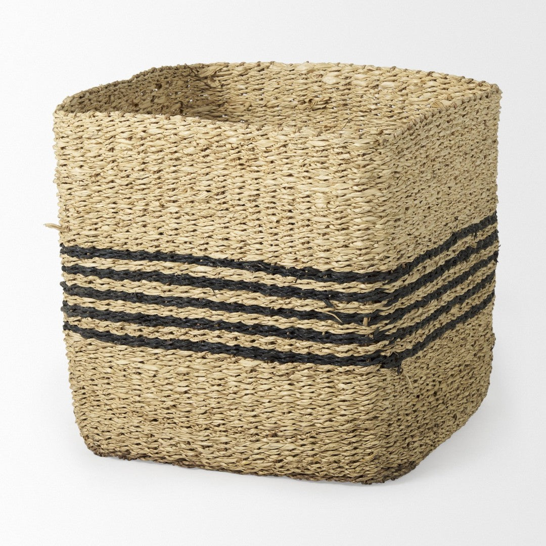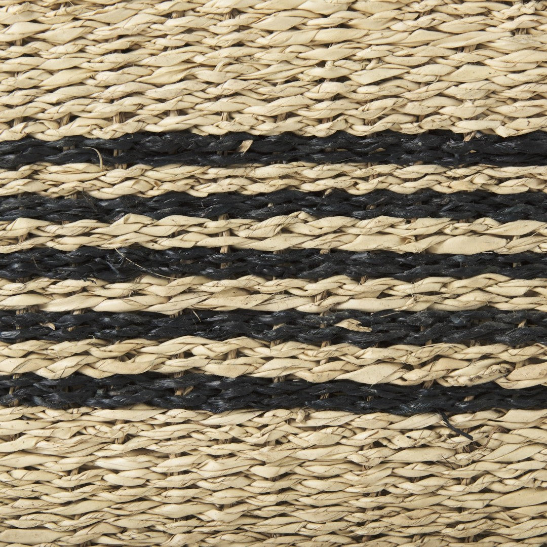 - These baskets feature natural seagrass with black stripes and two round handles on either side.