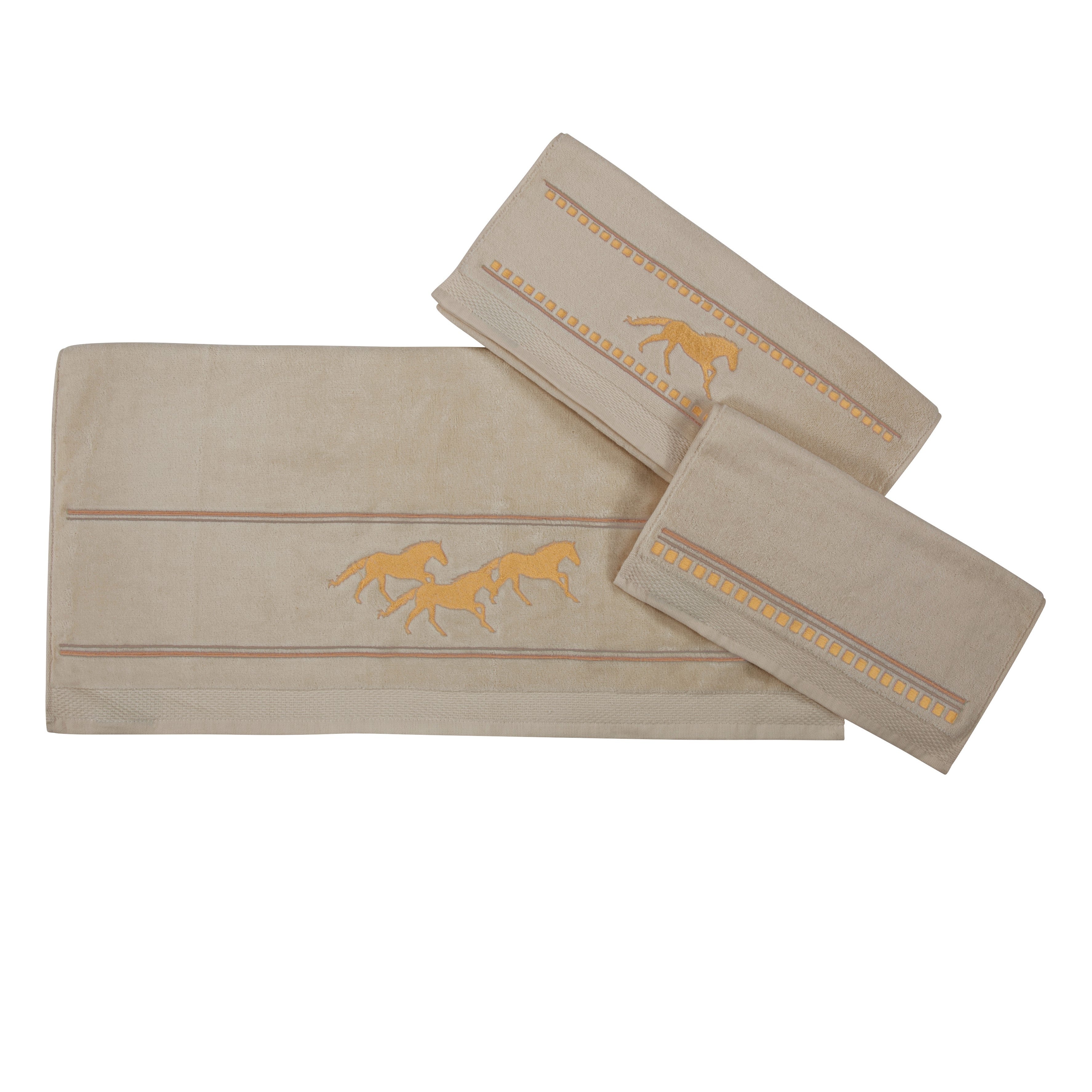 Transform your bathroom into a serene Western retreat with the Running Remuda Horse Towel Set. This beautifully designed collection showcases a dynamic scene of running horses, elegantly framed by striking geometric borders in calming earth tones. Crafted from ultra-soft, 100% cotton, these towels not only offer comfort and absorbency but also infuse your space with rustic charm. Available in a delightful cream and natural brown palette, this set is perfect for those looking to create a sophisticated Western-themed bathroom. Enhance your decor by pairing these towels with other coordinating accessories for a cohesive look.