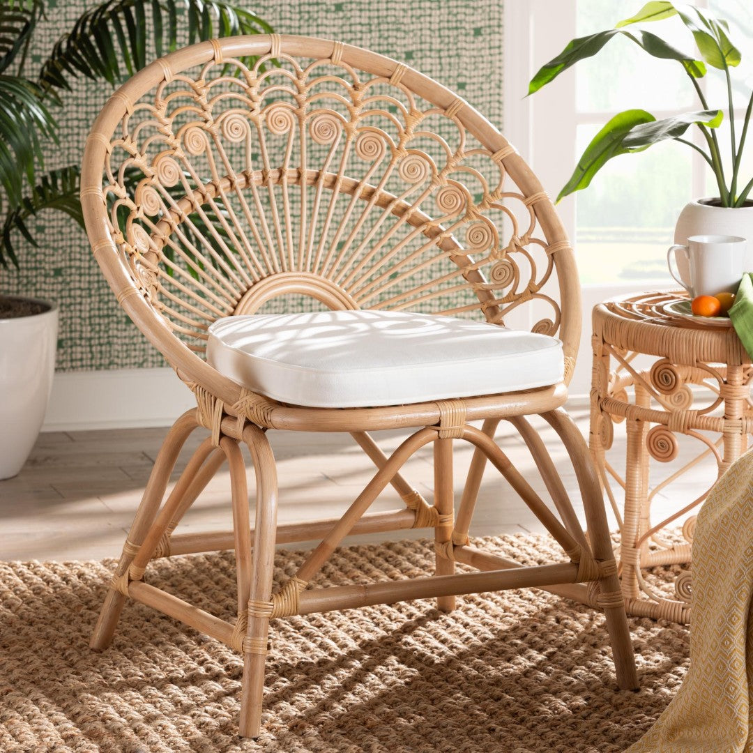 Bring relaxed bohemian charm to any room with the Abriella peacock accent chair. Handcrafted in Indonesia from natural rattan, this striking chair combines airy openwork and curled rattan detailing with comfortable seating—making it an eye-catching focal point in living rooms, bedrooms, sunrooms, or covered patios. The chair ships fully assembled and includes a removable, foam-padded cushion upholstered in soft fabric for immediate comfort.