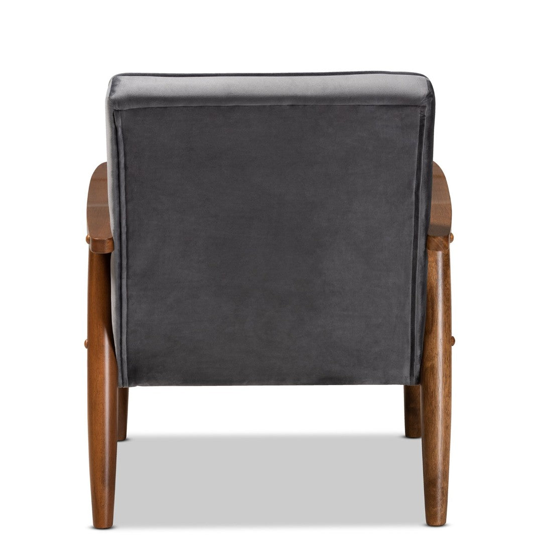 A refined reinterpretation of classic mid-century modern seating, this lounge chair blends sculptural form with everyday comfort. Upholstered in soft grey velvet and set on walnut-finished wooden legs, it offers a stylish focal point for living rooms, offices, waiting areas, or compact urban spaces. Lightweight yet sturdy, the chair balances vintage-inspired details—button tufting, splayed legs and sculpted arms—with contemporary durability and easy maintenance.