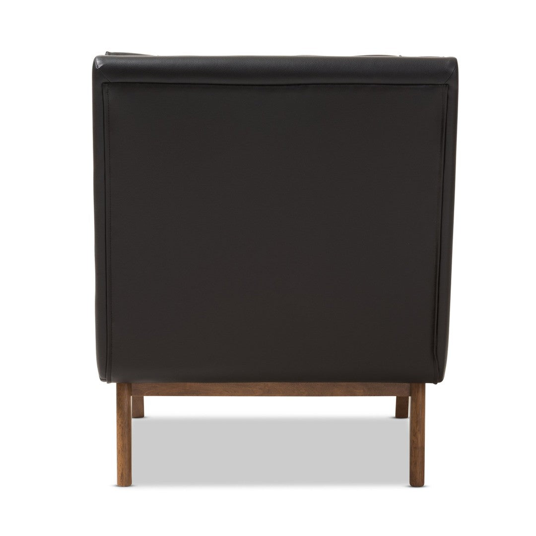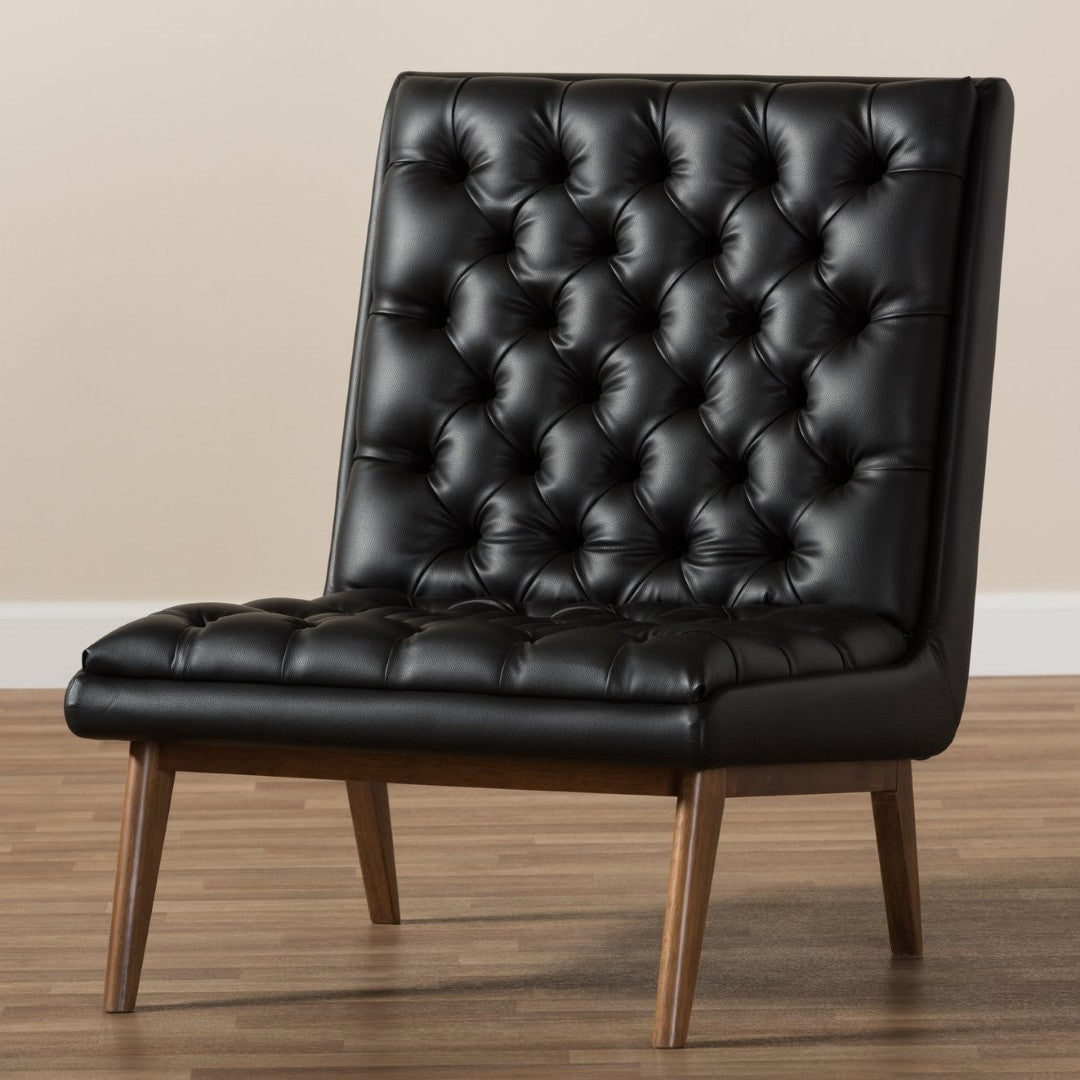 Sink into mid-century modern comfort with the Annetha lounge chair — a thoughtfully designed piece that blends clean, low-profile lines with plush, supportive seating. Upholstered in rich black faux leather and supported by sturdy walnut-finished rubberwood legs, this chair delivers an inviting look and durable construction ideal for living rooms, reception areas, or cozy reading nooks. Button-tufted detailing and foam padding enhance comfort while the reclined back and generous seat offer relaxed lounging.