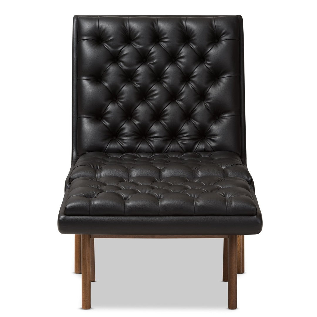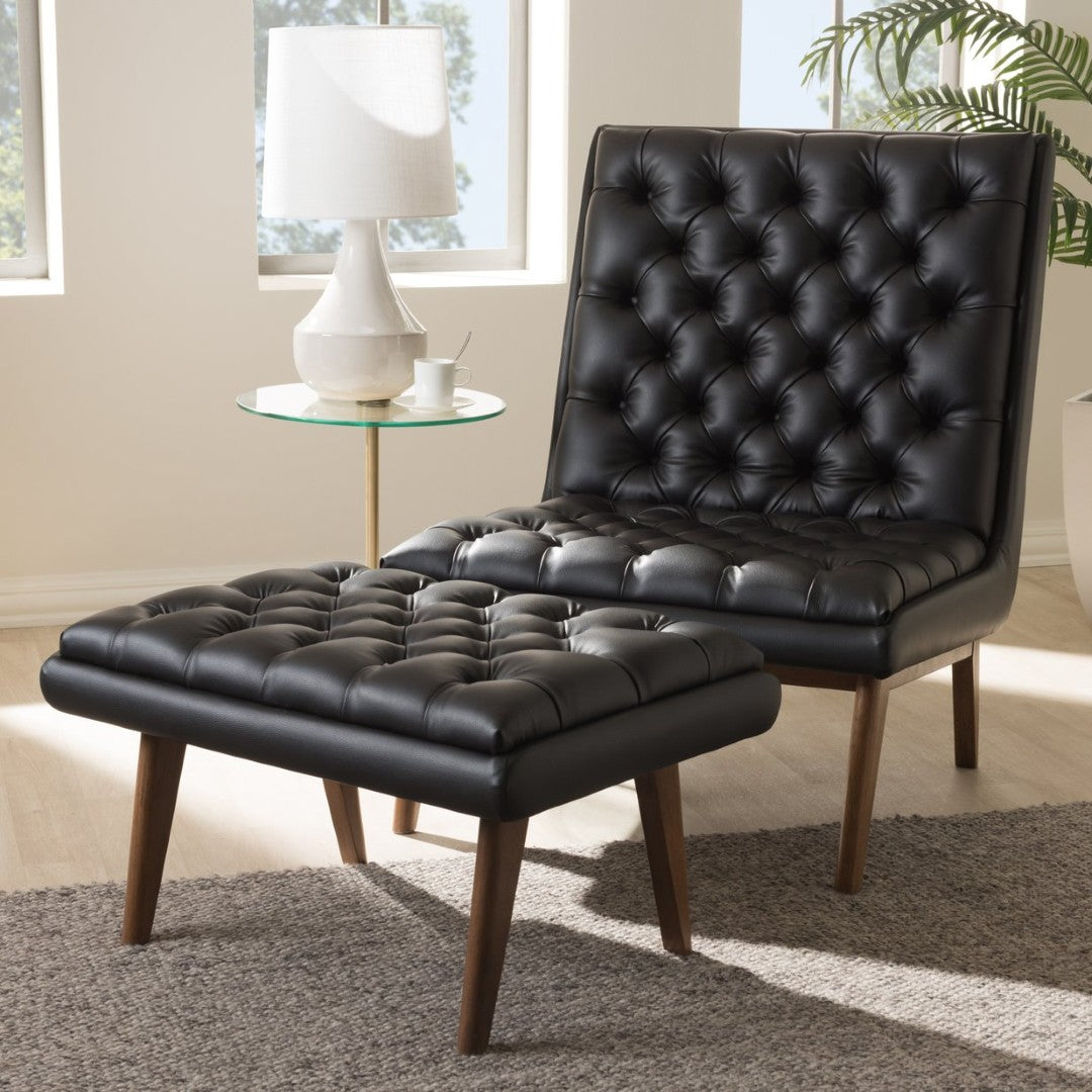 Sink into mid-century modern comfort with the Annetha lounge chair and ottoman set. Combining clean, angular lines with plush, foam-padded seating and rich walnut-finished wood legs, this set creates an inviting focal point for living rooms, lounges, waiting areas, or home offices. Durable construction and classic button-tufting give it a refined, lasting presence while the matching ottoman extends relaxation when you put your feet up.