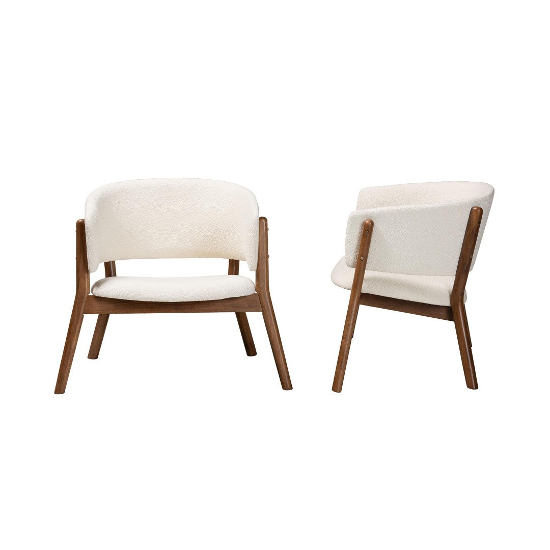 Elevate your living room or office with the Baron accent chair set — a refined mid-century modern pairing that blends timeless silhouette, cozy boucle upholstery, and warm walnut-toned wood. Each chair is thoughtfully padded and contoured for comfort, while splayed legs and tapered details deliver a subtle retro character that complements contemporary interiors. Ideal as a matched set for seating arrangements, reading nooks, or guest seating, these chairs balance sculptural style with everyday durability.