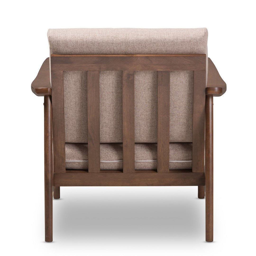 Relax in mid-century modern style with the Venza lounge chair — a thoughtfully designed single-seater that blends vintage-inspired form with everyday comfort. Built on a solid rubberwood frame and finished in rich dark walnut, this chair brings warm, timeless character to living rooms, bedrooms, offices, or waiting areas. Plush, removable cushions upholstered in light brown polyester deliver soft support while remaining durable for regular use. Clean paneled lines, sloping arms and splayed legs create an elegant silhouette that complements both minimalist and contemporary interiors.