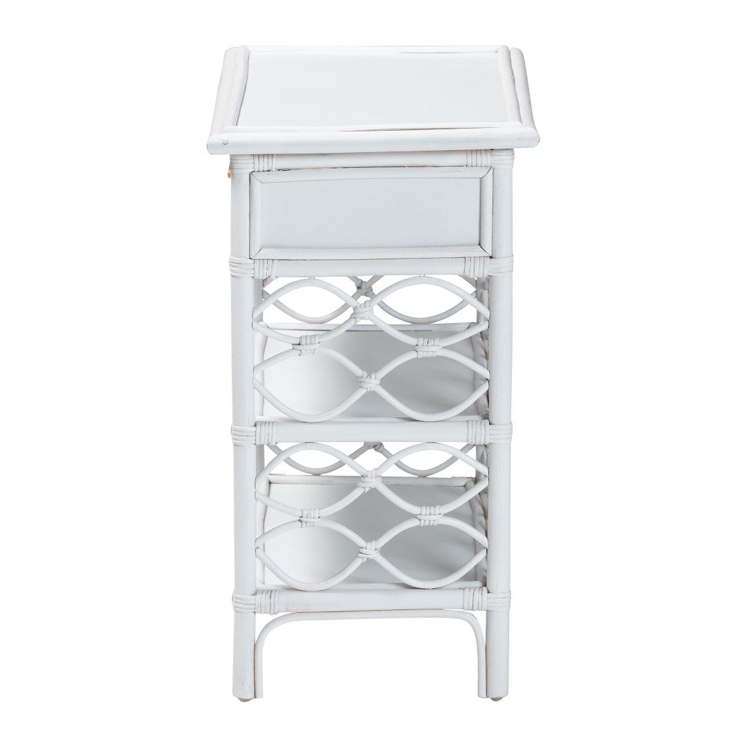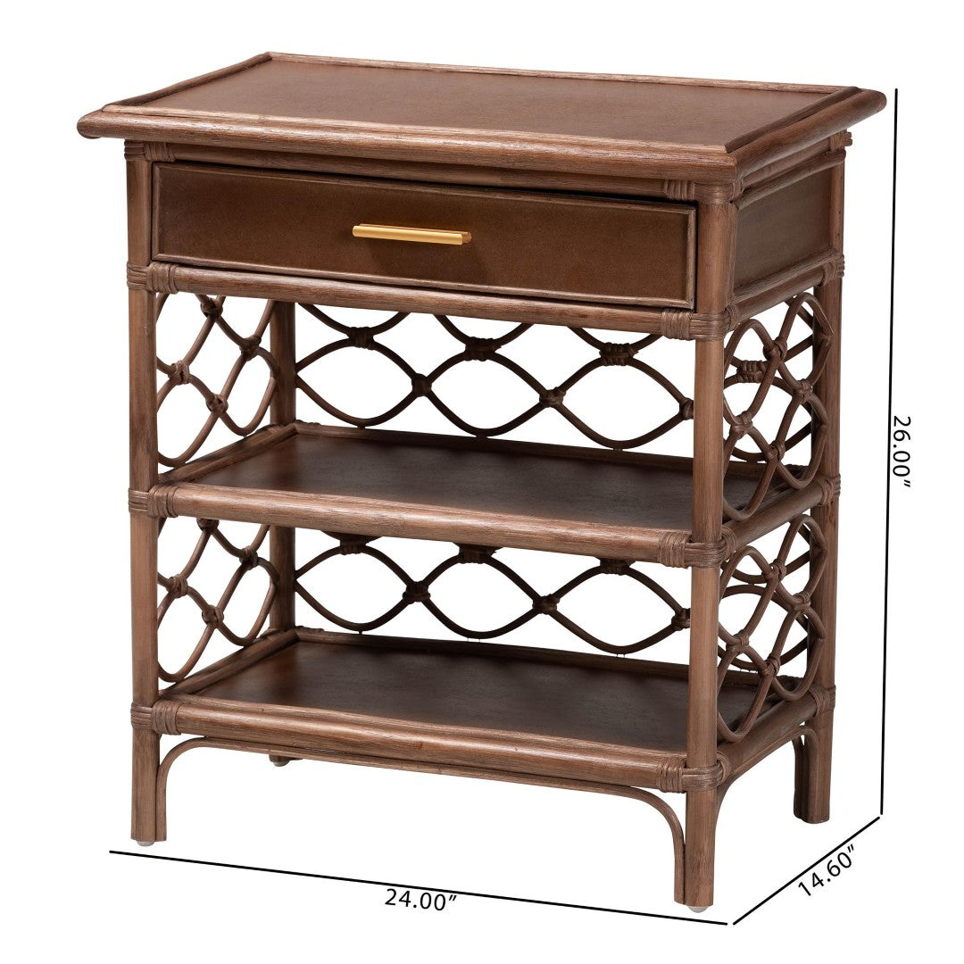 Bring a warm, coastal-boho vibe to your bedroom with the Akane nightstand — a handcrafted piece from Indonesia made of sustainably sourced natural rattan. Its lattice-inspired rattan pole detailing and flared-edge tabletop create an airy, sculptural silhouette while practical storage (one drawer plus two open shelves) keeps bedside essentials organized and within reach. The nightstand arrives fully assembled and combines natural texture with a slim metal drawer pull for a refined, modern touch.