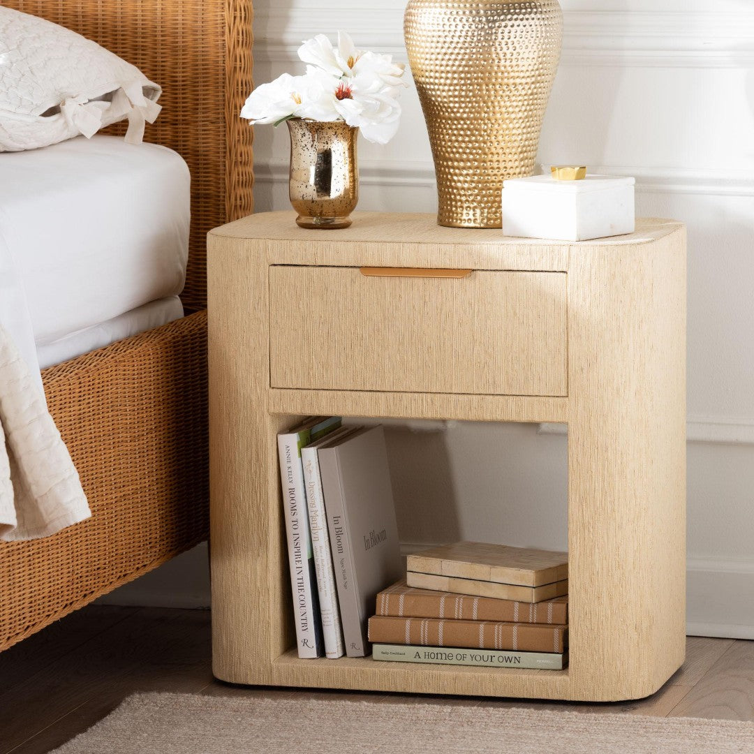 Bring coastal-bohemian warmth and organized function to your bedroom or living area with this handwoven grasscloth nightstand. Its rounded silhouette, gold-tone handle, and natural texture create a relaxed yet refined look, while a single drawer and open shelf keep bedside essentials neatly stowed and within reach. Crafted in Indonesia and arriving fully assembled, this piece pairs well with modern, coastal, and eclectic interiors.