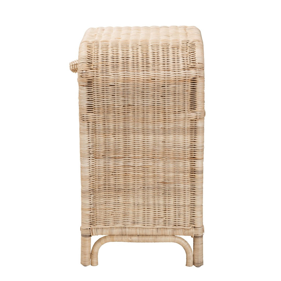 - Design: Rounded modern-bohemian profile with woven rattan embellishments and a round woven drawer knob for a cohesive look.