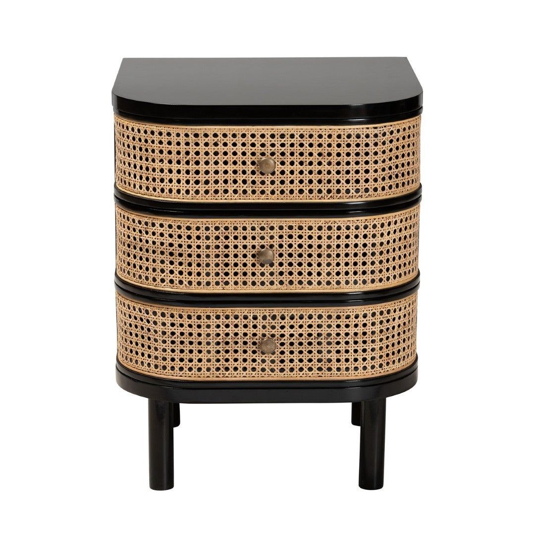 Bring warm, relaxed style to your bedroom or living room with this Modern Bohemian nightstand. Handcrafted in Indonesia from solid Bayur wood and natural woven rattan, it pairs organic textures with practical storage—three drawers keep essentials organized while a generous tabletop serves as a bedside or end table surface. The curved silhouette, rounded legs, and contrasting round drawer knobs create a refined yet inviting look that complements eclectic, coastal, or contemporary interiors.