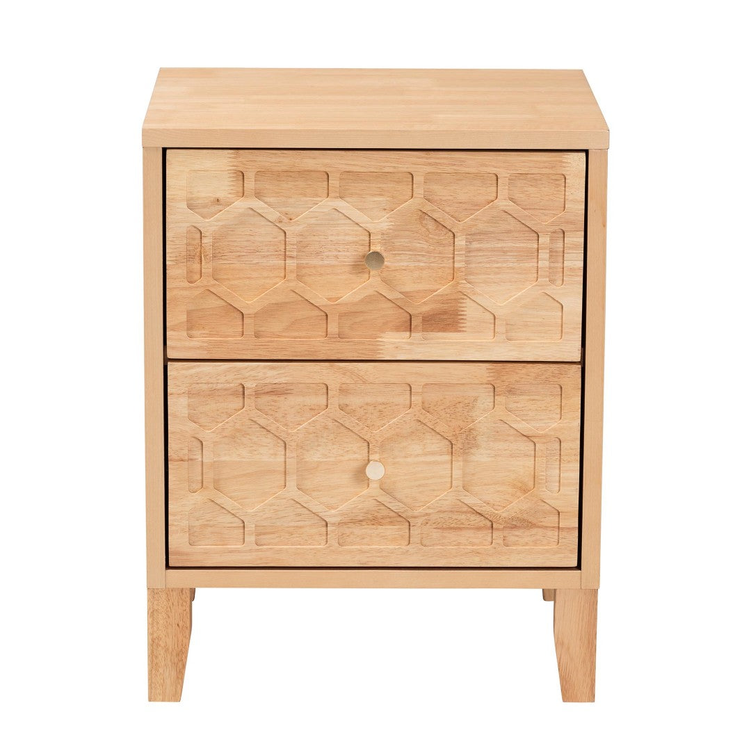 Bring calm, contemporary elegance to your bedroom with the Hosea nightstand — a Japandi-inspired fusion of Japanese minimalism and Scandinavian warmth. Crafted from a blend of rubberwood and engineered wood and finished in a natural honey tone, this compact bedside table pairs sculptural honeycomb-carved drawer fronts with tapered legs for a balanced, serene silhouette that elevates modern and transitional spaces alike.