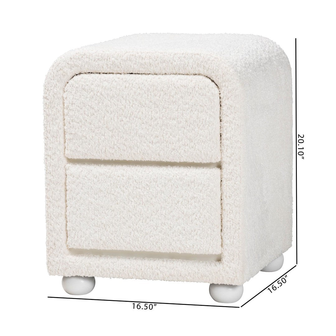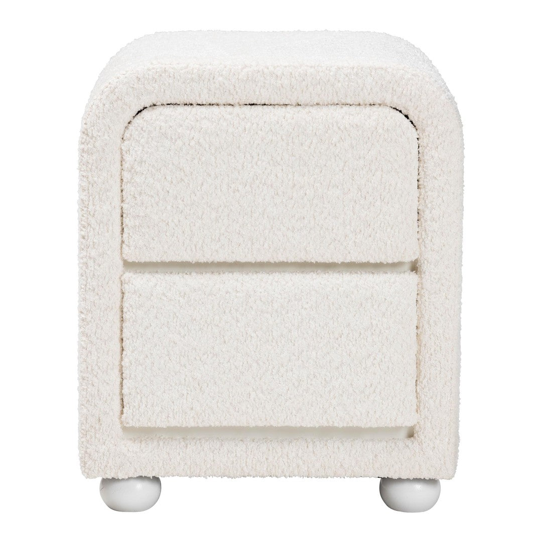 Bring a warm, tactile element to your bedroom with this modern nightstand upholstered in soft teddy-bear fabric. Designed for both comfort and function, the piece pairs a plush, foam-padded exterior with a sturdy wood frame and rounded rubberwood legs for dependable support. Its clean, handle-less profile and compact footprint make it an ideal bedside companion for minimalist and contemporary interiors alike.
