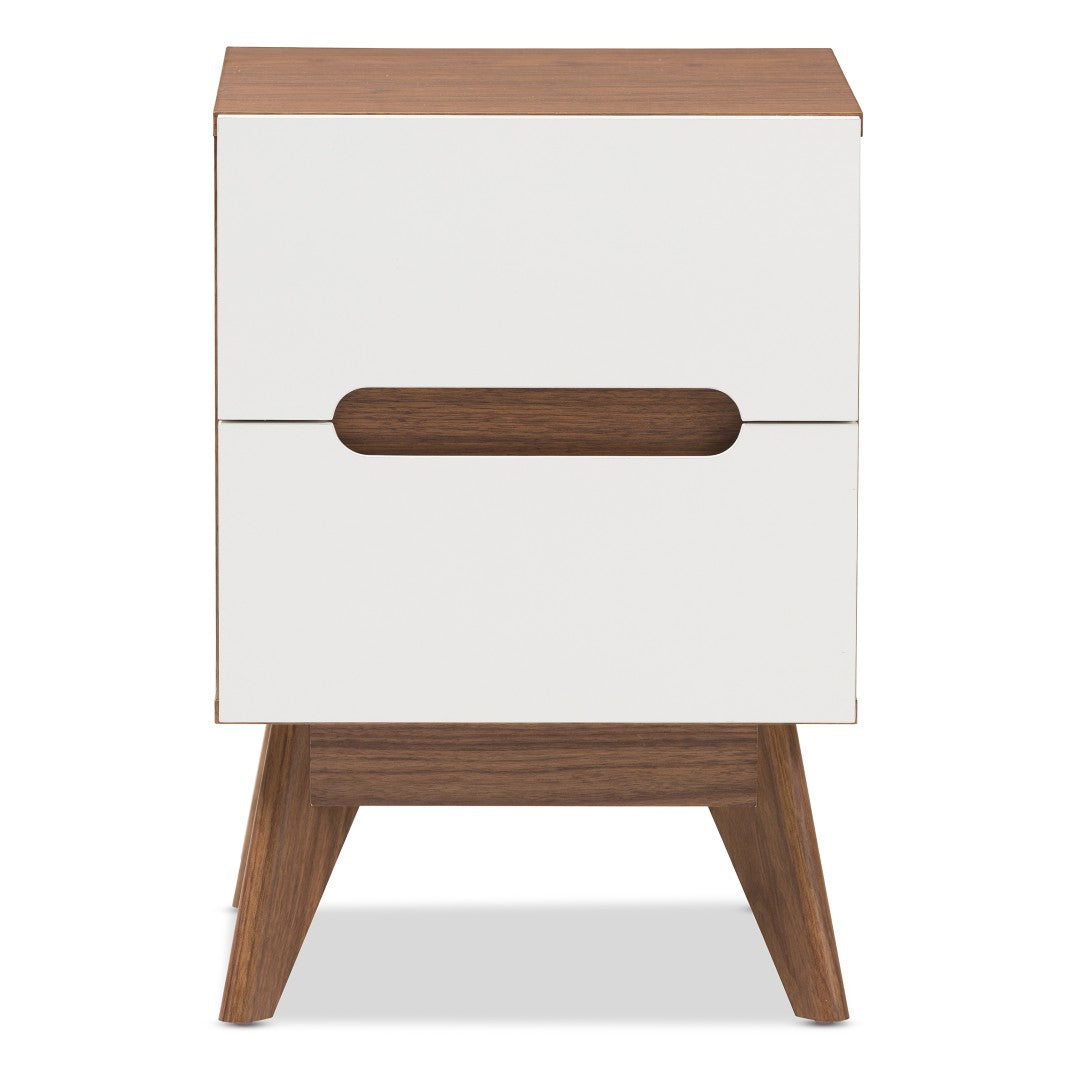 Bring mid-century Scandinavian flair to your bedroom with a compact, two-tone nightstand that balances form and function. Clean lines, angled legs, and a warm walnut contrast against crisp white panels for a versatile piece that complements modern and retro interiors alike. Ideal for keeping bedside essentials organized while adding a refined focal point to your sleep space.