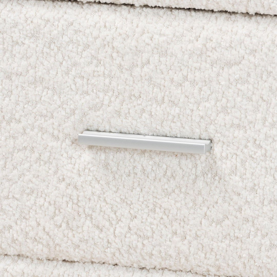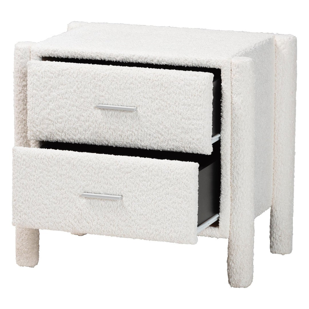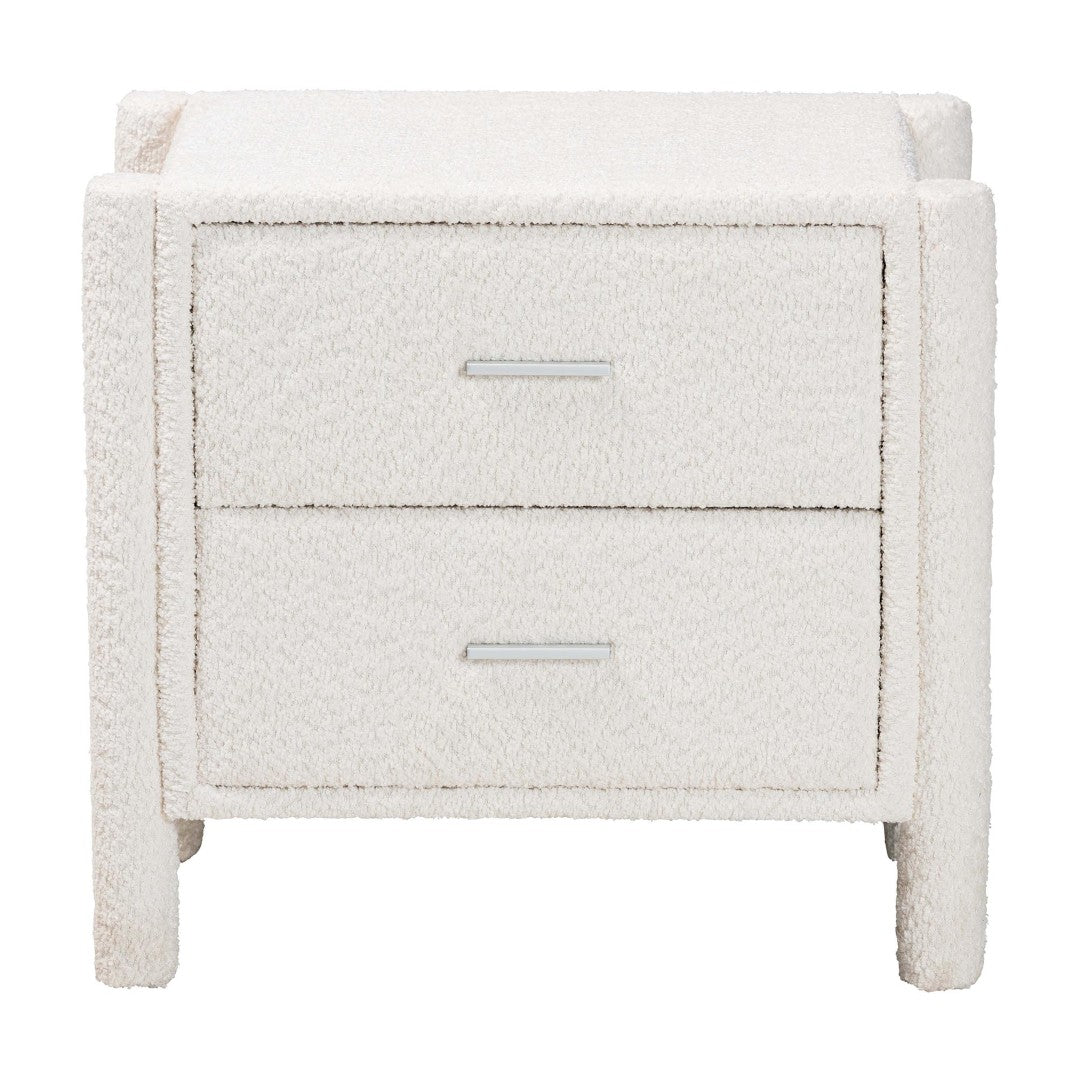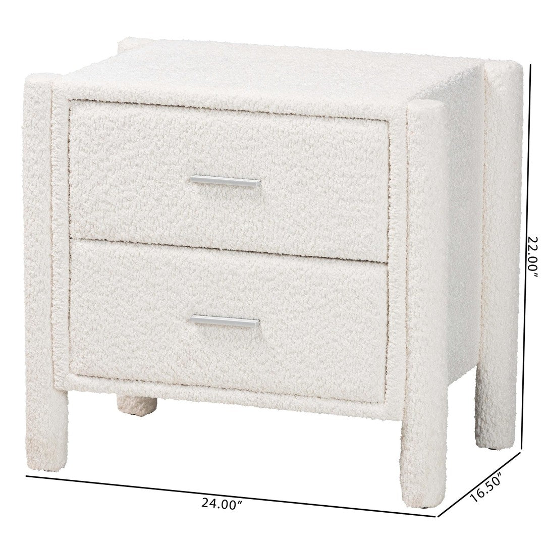 Bring soft, modern comfort to your bedroom with this plush two-drawer nightstand. Upholstered in luxurious teddy-bear fabric and built on a solid wood frame, it blends tactile warmth with clean contemporary lines to create a serene bedside focal point. The padded exterior, rounded posts, and minimalist hardware make it equally suited for cozy and modern interiors, while two interlocking drawers keep bedside essentials neatly organized.