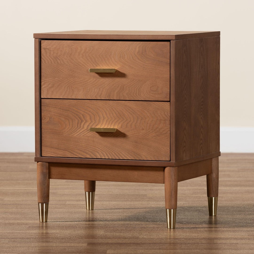 Bring mid-century elegance and practical storage to your bedroom with this refined two-drawer nightstand. Its warm ash walnut finish, tapered legs with metal caps, and slim metal drawer pulls create a clean, timeless silhouette while two roomy drawers and a handy tabletop keep bedside essentials organized and accessible. Built from rubberwood and engineered wood and crafted in Malaysia, this piece balances style, stability, and everyday function.