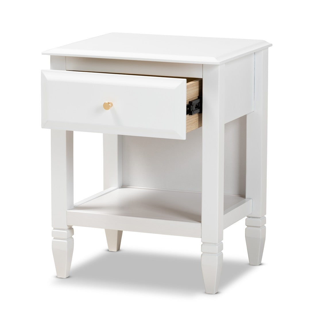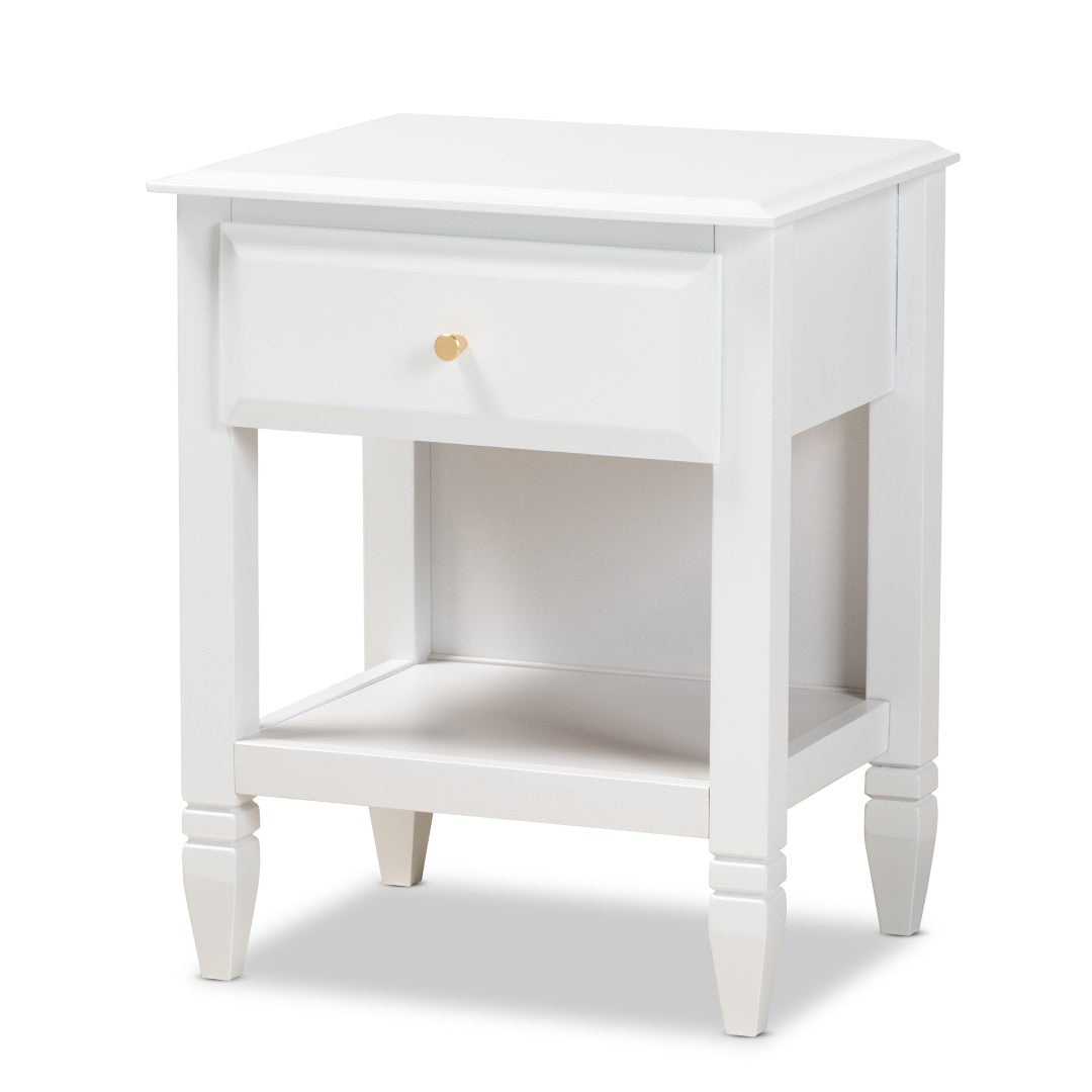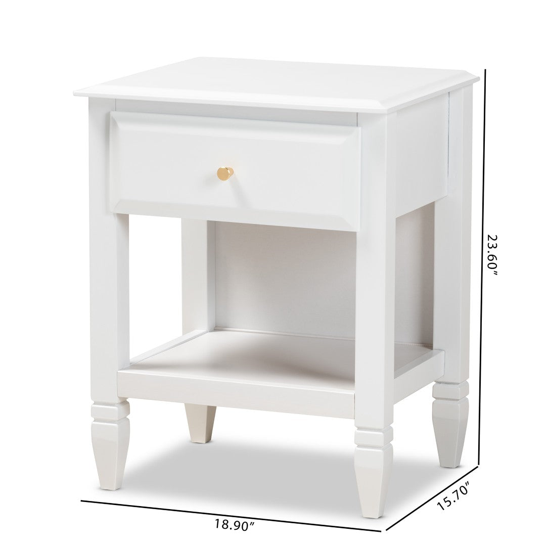 Add a timeless touch of elegance to your bedroom with this refined white nightstand that blends classic proportions and subtle glamour. Crafted from solid rubberwood and MDF with a polished white finish and gold-tone hardware, it offers convenient bedside storage and a clean, tailored look that complements both traditional and transitional décor.