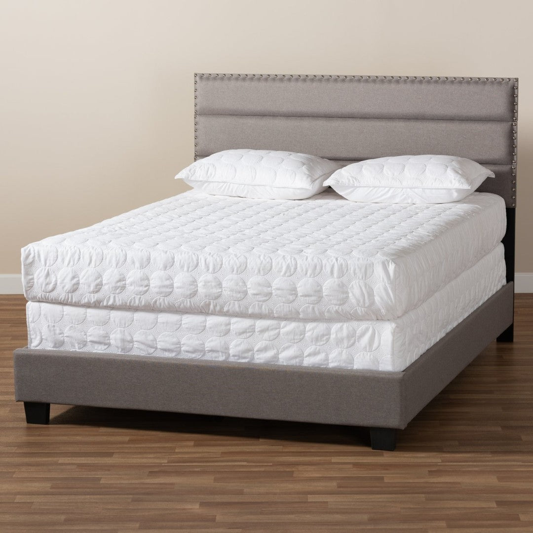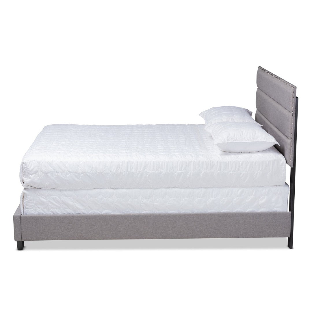 Anchor your bedroom in modern elegance with the Ansa bed, a queen-size platform designed for comfort and contemporary style. Upholstered in soft, foam-filled polyester with channel tufting and silver nailhead trim, this bed blends refined detailing with a sturdy engineered wood frame. Black tapered legs create a sleek silhouette while providing stable support. A box spring is required for use; product is made in Malaysia and requires assembly.