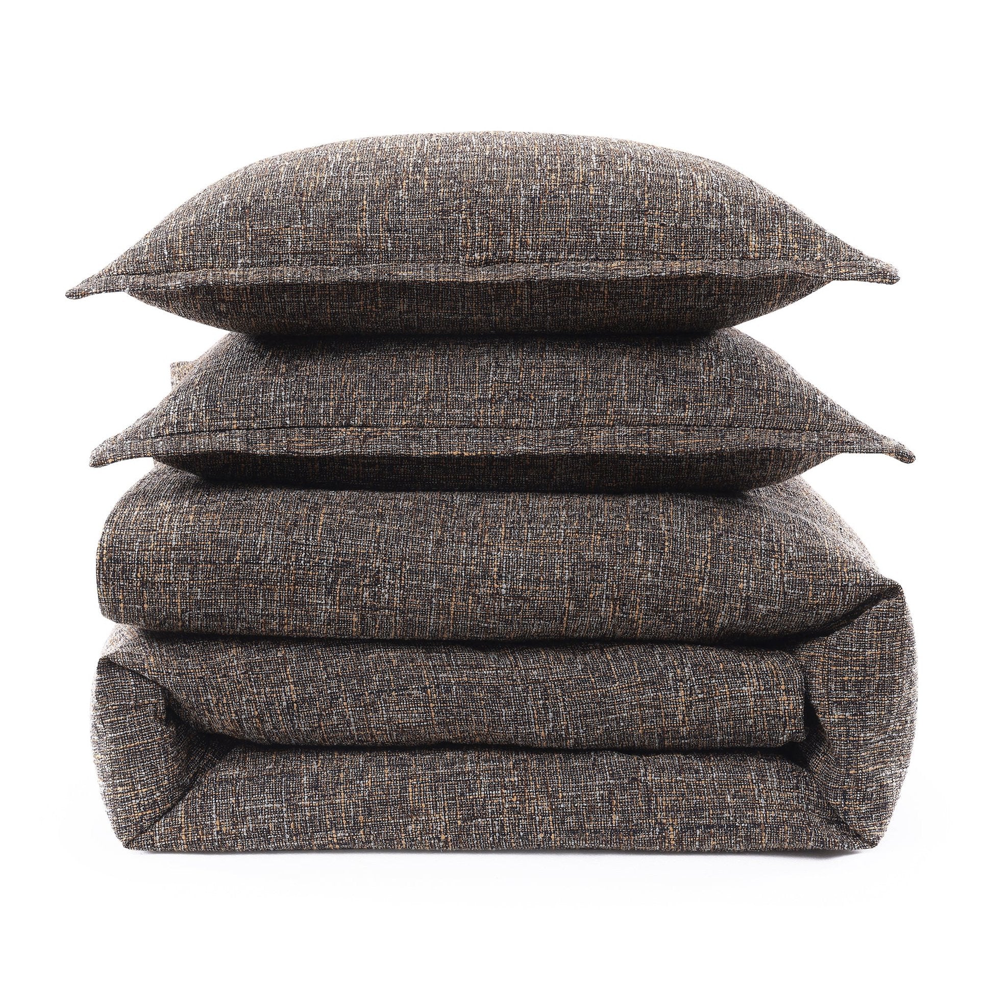 Transform your bedroom into a sanctuary of style and comfort with our exquisite Tweed Comforter Set. Inspired by the timeless elegance of classic menswear, this three-piece ensemble brings a touch of sophistication to your space. The comforter is crafted from multi-colored boucle yarns, expertly woven to create a rich texture that not only looks great but feels incredibly cozy. The dense construction provides a comforting weight, ensuring warmth and a sense of security as you unwind. Available in two versatile colorways—cool-toned navy blue and a soft neutral brown—this comforter set effortlessly complements modern rustic and contemporary interiors. Enhance your bedding experience by pairing the navy variant with our High Satin Collection or the neutral brown with our 100% French Flax Linen Collection for a polished look.