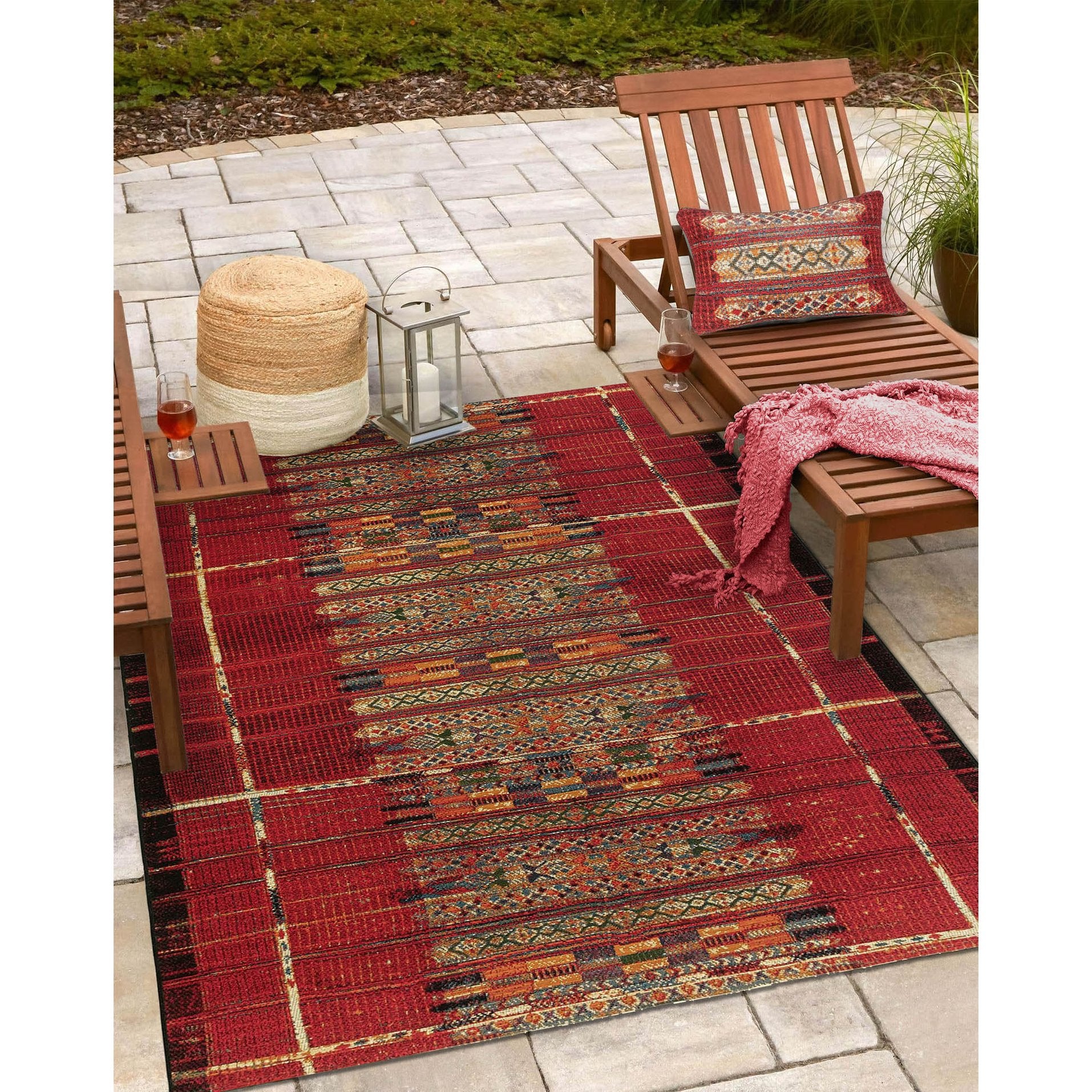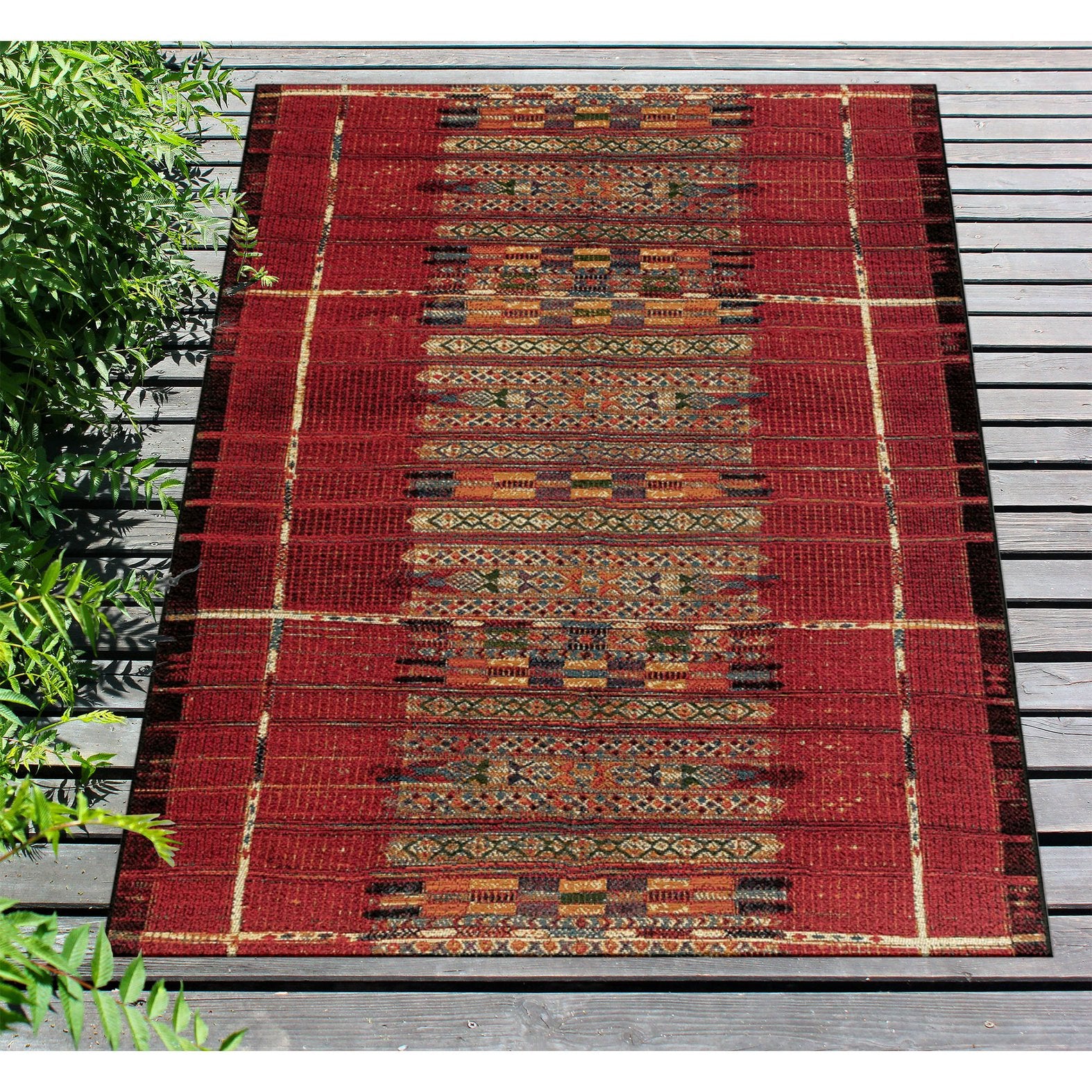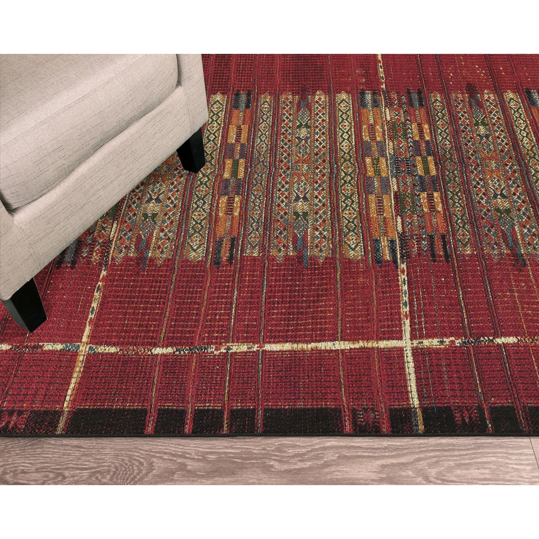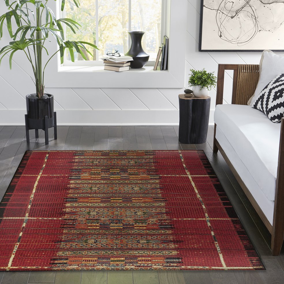 - Features a Transitional Tribal Stripe Pattern that features a linear design in bold red