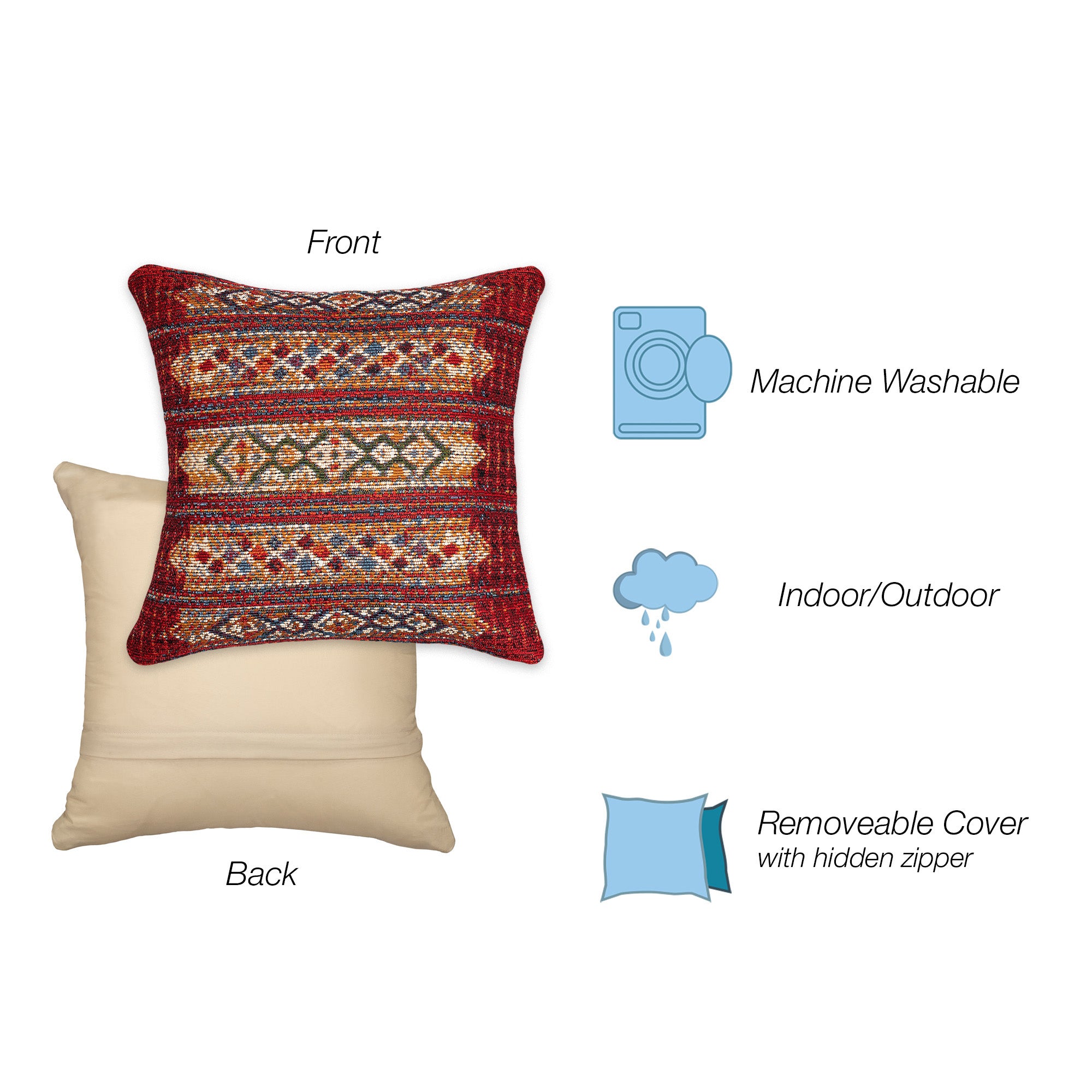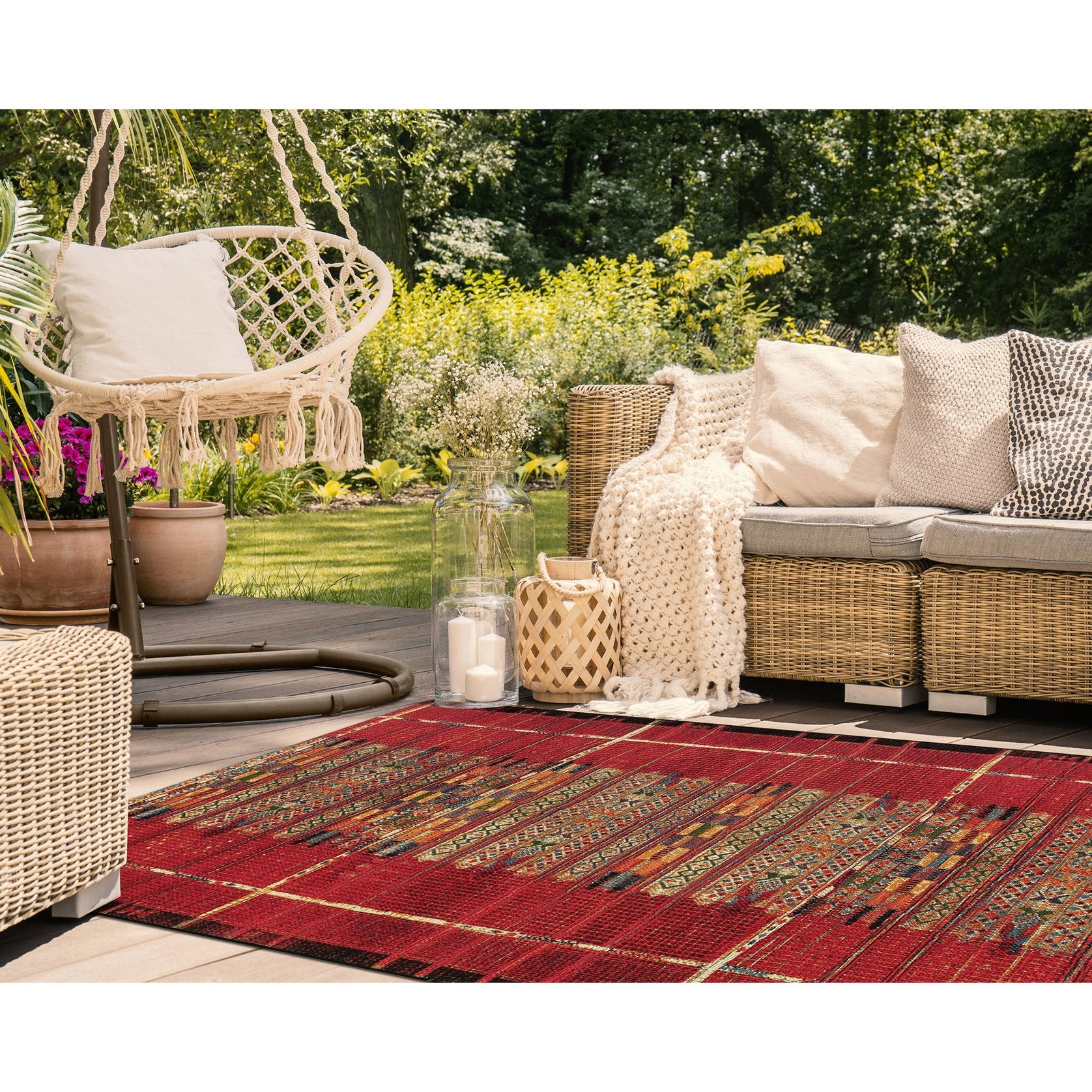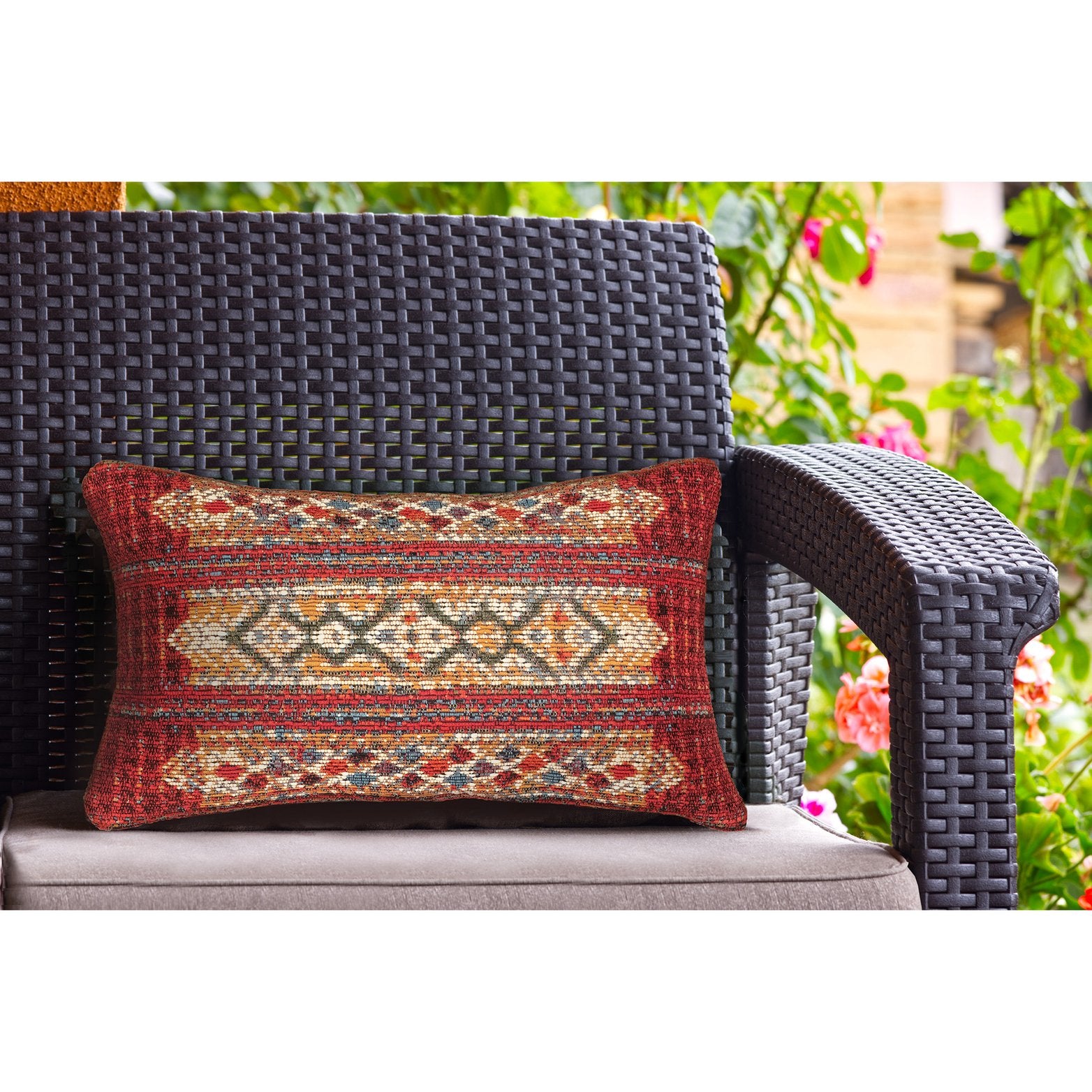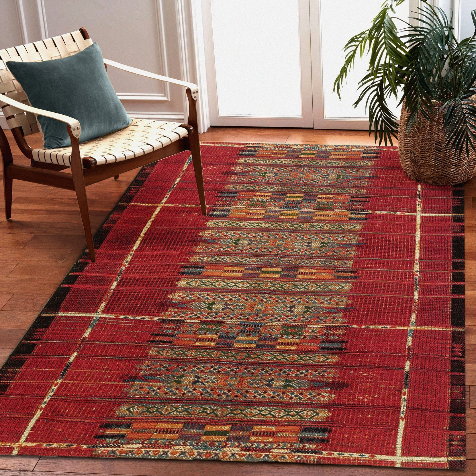 - Features a Transitional Tribal Stripe Pattern that features a linear design in bold red