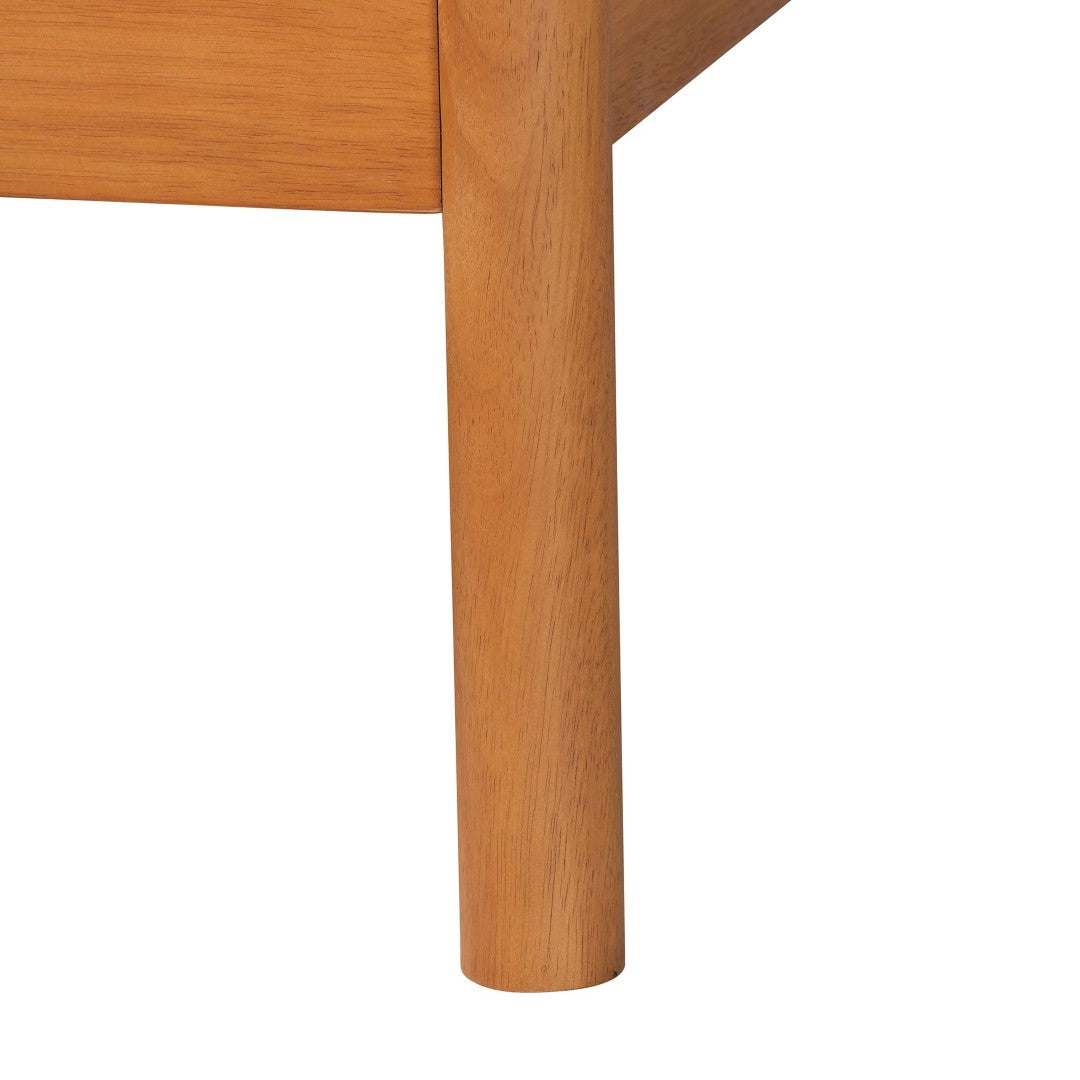 - Materials & finish: Solid rubberwood + engineered wood construction with distressed-finished woven rattan details for texture and visual warmth.