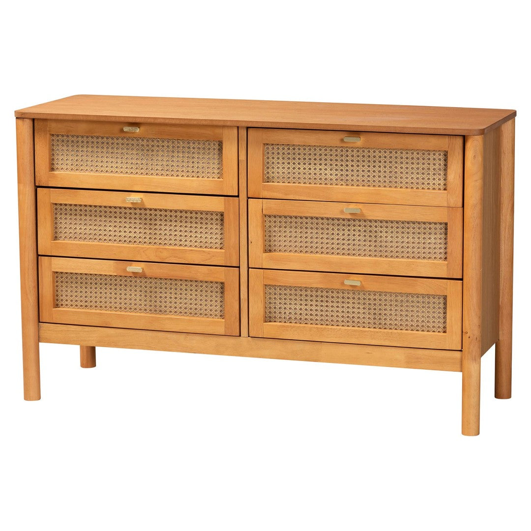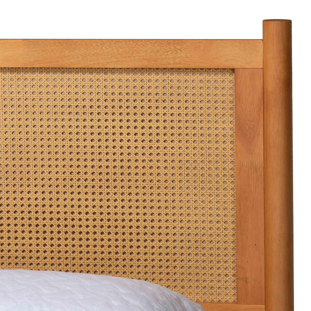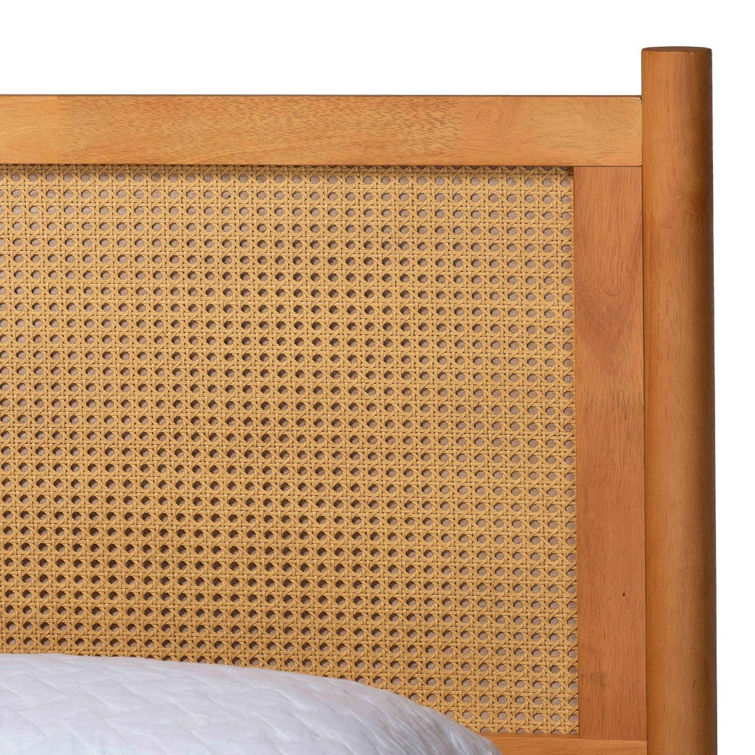 Invite tranquil, warm sophistication into your bedroom with the Jenn 4-piece Japandi bedroom set. Crafted from rubberwood and engineered wood with woven distressed-finish rattan accents, this collection blends Scandinavian simplicity and Japanese calm to create a peaceful, functional retreat. The set is designed for everyday living—soft-close drawers, rounded posts, and wood-slat mattress support combine to deliver comfort and thoughtful utility without the need for a box spring.